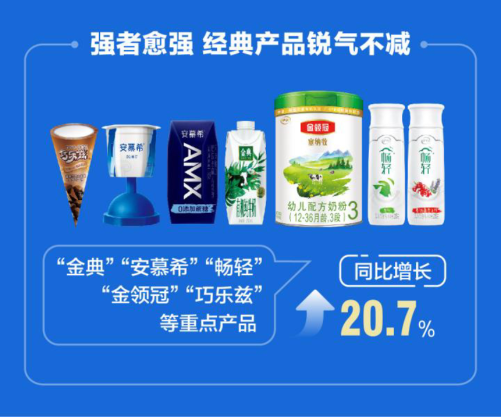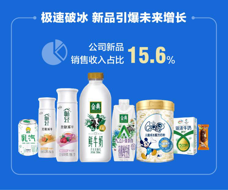 报告期内,伊利旗下“金典”“安慕希”“畅轻”“金领冠”“巧乐兹”等重点产品销售收入同比增长20.7%,增长势头迅猛;以“金典”A2β-酪蛋白有机纯牛奶、“伊利”臻浓高钙牛奶、“畅轻”蔗糖减半果茶酸奶、“QQ星”儿童成长配方羊奶粉、“巧乐兹”巧榛橘冰激凌、“优酸乳”乳汽气泡乳等为代表的新品收入占比15.6%,成为业绩增长的重要驱动力。