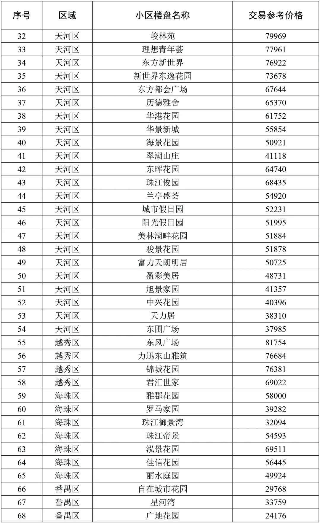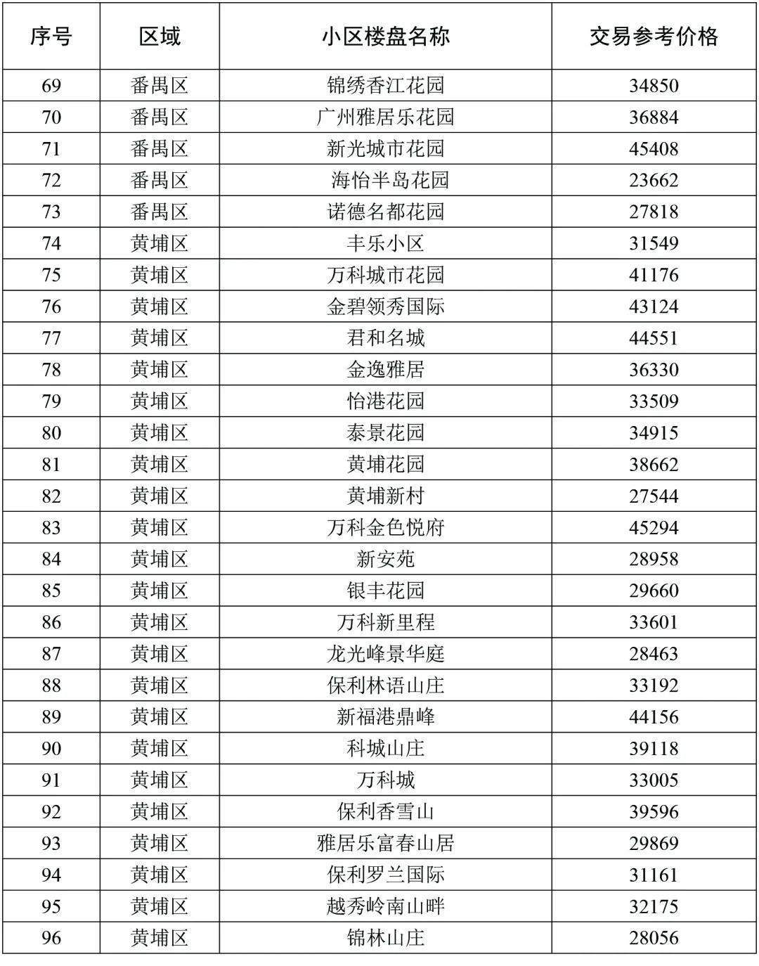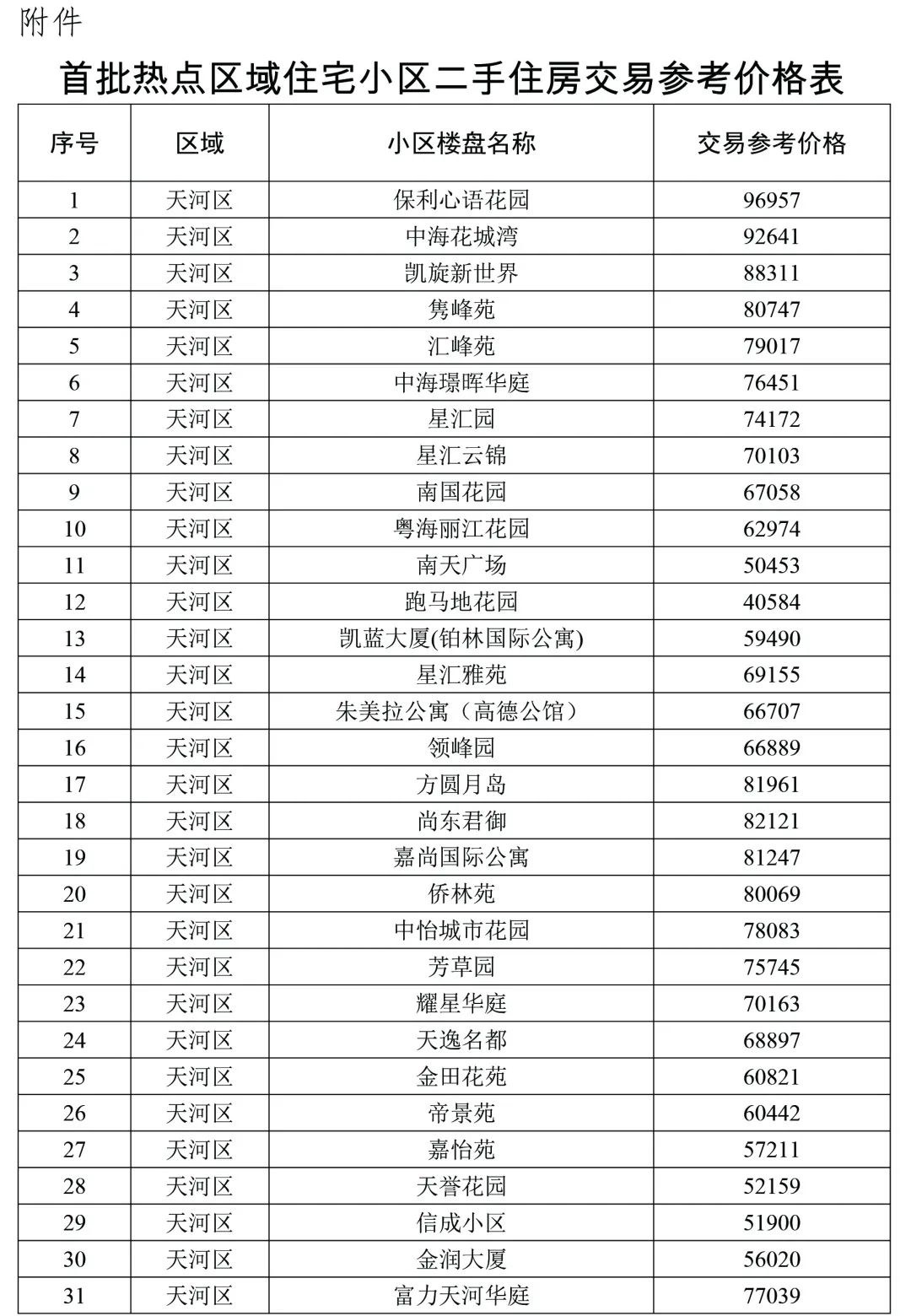 5. The Guangzhou Municipal Housing and Urban-Rural Development Bureau on Tuesday issued a notice on setting benchmark prices for second-hand housing transactions and announced the referential trading prices for second-hand homes in 96 residential communities across the city.