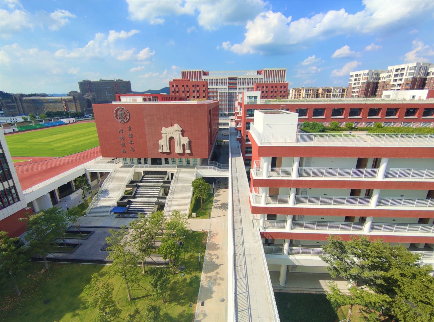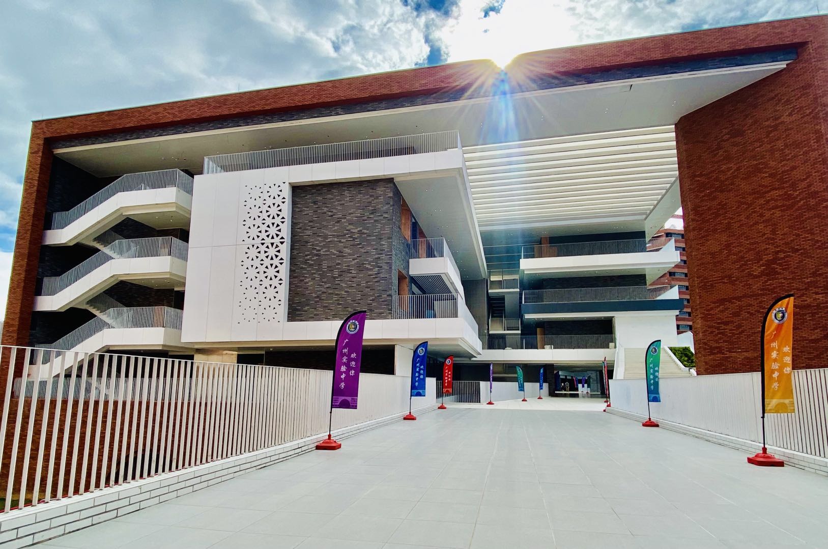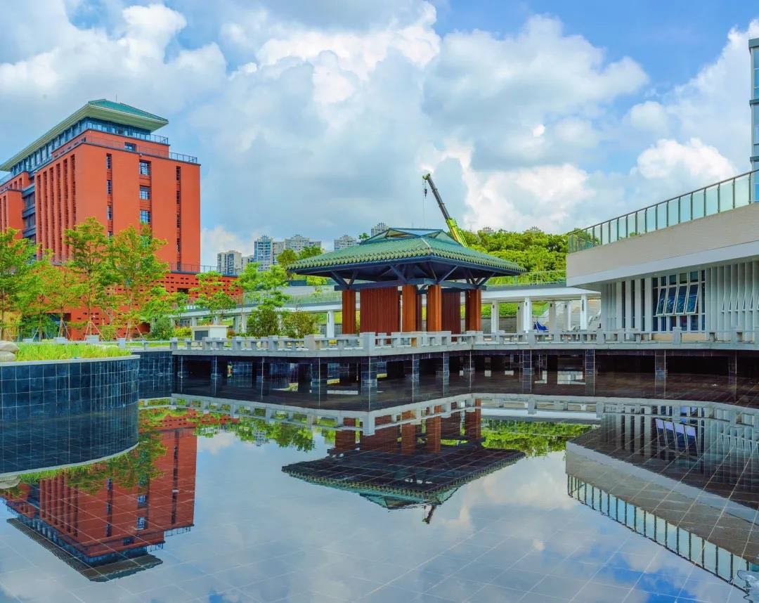 8月28日,广州市执信中学天河校区正式揭牌投入启用。红墙绿瓦的执信门,岭南风建筑有着浓浓书院氛围,风雨廊串联校区各处,从教学楼落地窗望过去,山水相映。