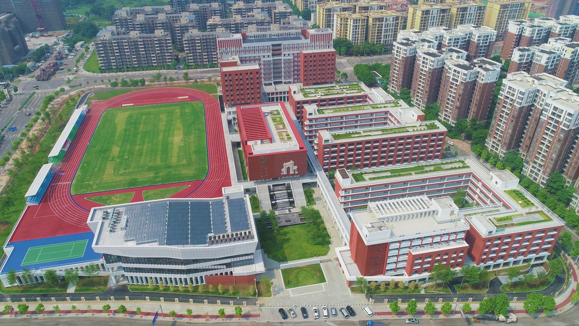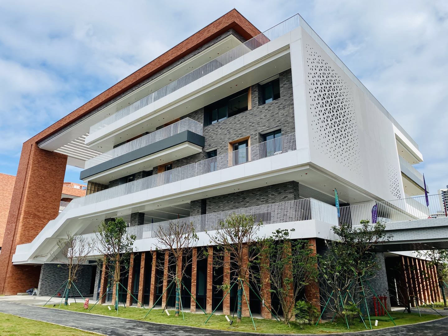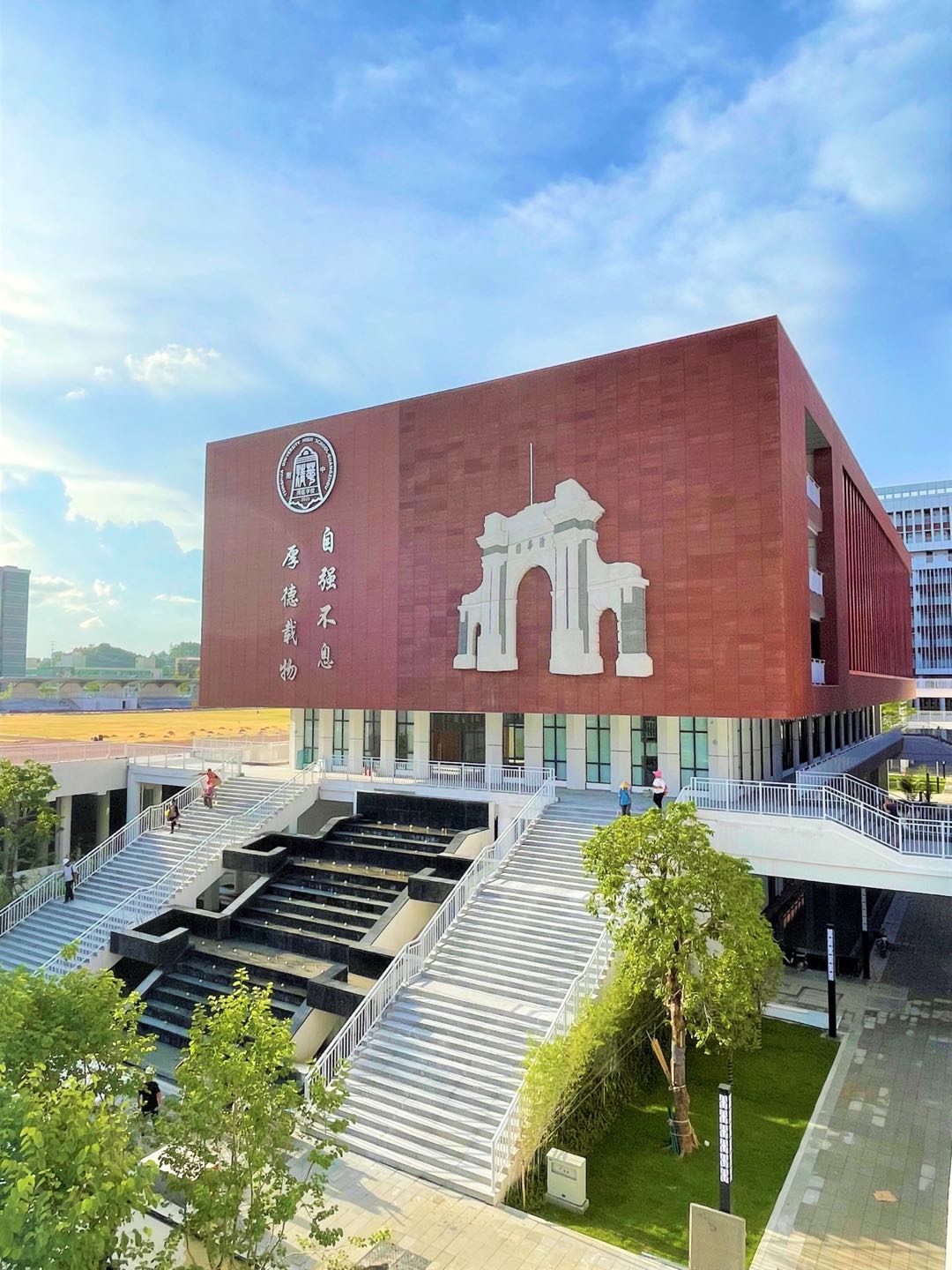 8月28日,广州市执信中学天河校区正式揭牌投入启用。红墙绿瓦的执信门,岭南风建筑有着浓浓书院氛围,风雨廊串联校区各处,从教学楼落地窗望过去,山水相映。