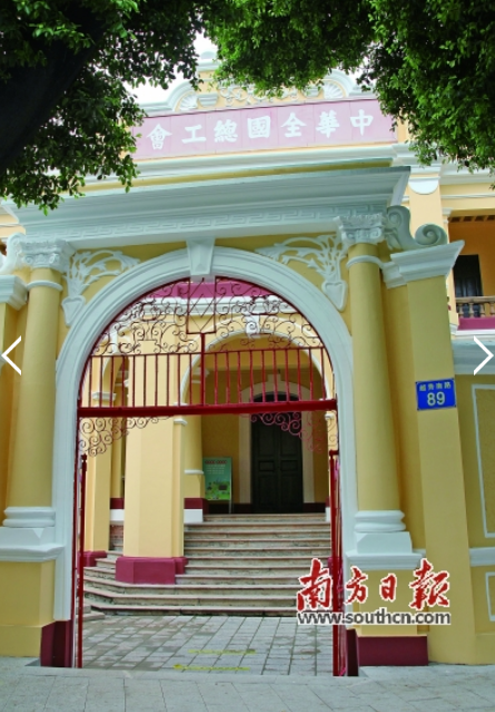 中华全国总工会旧址位于广州市越秀南路,由刘少奇题写的牌匾熠熠生辉。