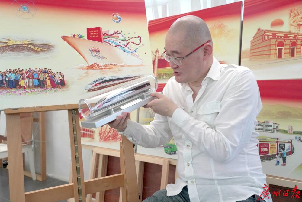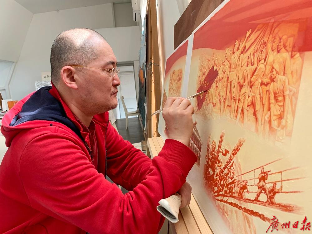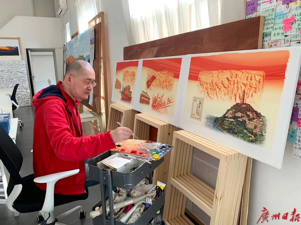 郝军正在绘制人民大会堂壁画《金山岭晨光》“作为一个艺术工作者,能够担当建党百年纪念邮票的设计工作,是我莫大的荣幸。所以当时召开创作推进会的时候,我第一个就报名了。”然而创作邮票,即便对于这位承接过多次重大任务的艺术家来说,也是第一次。郝军在接受广州日报全媒体记者专访时坦言:“报名的时候,具体设计的票数没有确定,从历史上来看,一般以两枚为主,没想到最后需要设计的是20枚,确实感到压力非常大。”