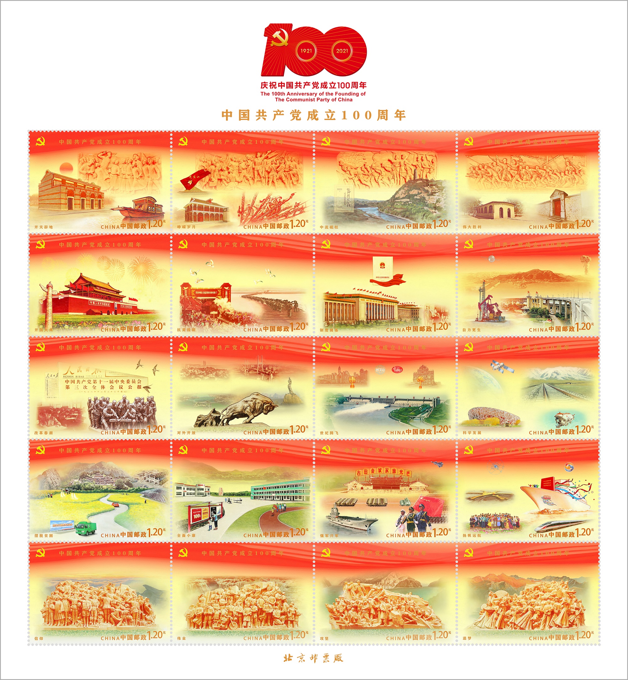 《中国共产党成立100周年》纪念邮票于今年7月1日由中国邮政发行,是建党周年系列邮票中发行枚数最多、表现内容最广、发行规格最高的一套。邮票采用连票设计形式,运用油画写实手法表现,20枚邮票就是20幅绘制完整的油画,并采用连绵不断的飘带贯穿整体,寓意中国共产党百年奋斗的光辉历程。