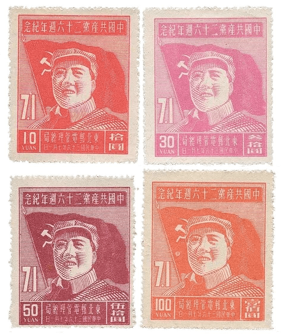 我国第一套纪念中国共产党成立的邮票,是东北邮电管理局1947年7月1日发行的《中国共产党二十六周年纪念》邮票,全套4枚,由哈尔滨广发印刷所采用水印绢丝纸胶版印制。图案为戴八角帽的毛泽东头像,背景为中国共产党党旗,同图异值异色,上端为“中国共产党二十六周年纪念”字样,左下面值上为阿拉伯空心字“71”,邮票分别为10元(红)、30元(玫红)、50元(紫红)、100元(桔红)。