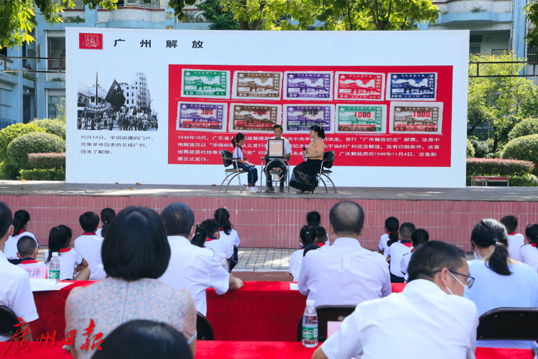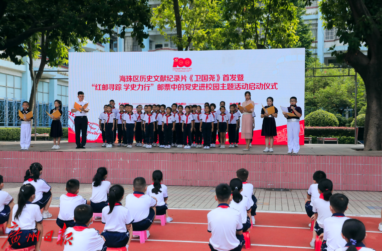 今天是2021新学年开学首日,“开学第一课”意义重大。广州日报社联合中共广州市海珠区委党史学习教育领导小组办公室、中共广州市海珠区委组织部、中共广州市海珠区委宣传部、中国邮政集团有限公司广州市分公司举办的历史文献纪录片《卫国尧》首发暨“红邮寻踪 学史力行”邮票中的党史进校园主题活动启动仪式9月1日上午在海珠区卫国尧纪念小学举行。