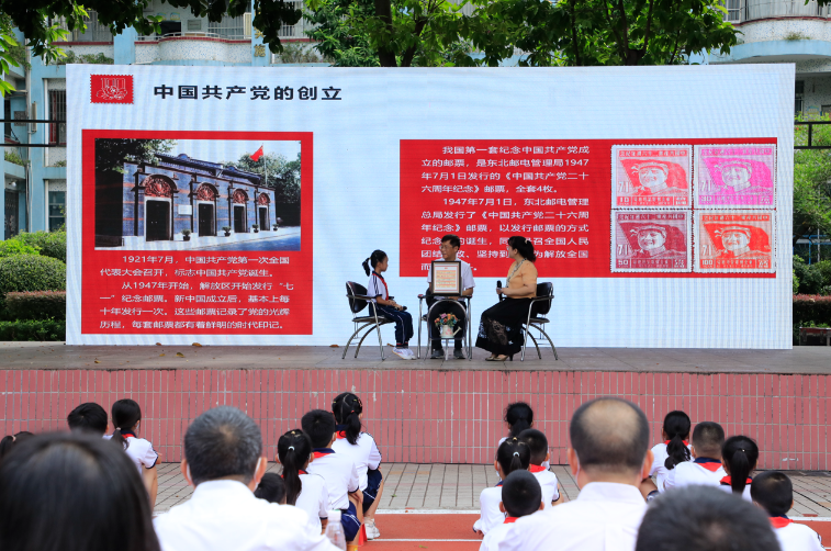 邮票是国家名片,我国推出的不少邮票在方寸之间记载了中国共产党百年历史征程上的重要事件和人物。此次活动是为扎实推动党史学习教育进校园工作,通过“线上+线下”形式为学校师生上了一节生动的“党史课堂”,帮助广大青少年扣好人生第一粒扣子,让红色基因、革命薪火代代相传。