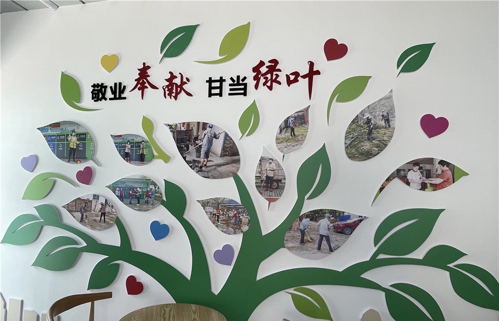 在实践体验区,可以了解各类垃圾的降解周期,还能看到小朋友们利用可回收物制作的各种手工艺品,生动诠释着何谓“垃圾分类变废为宝”。艺术品展示的上方是一个电视展示屏,内有垃圾去向科普和体感互动游戏,可以让参与者在玩乐的同时获取垃圾分类相关知识。展厅还设有可折叠屏风,平时可与环卫工人休息室隔开,互不干扰,必要时可打开扩展宣教活动空间。