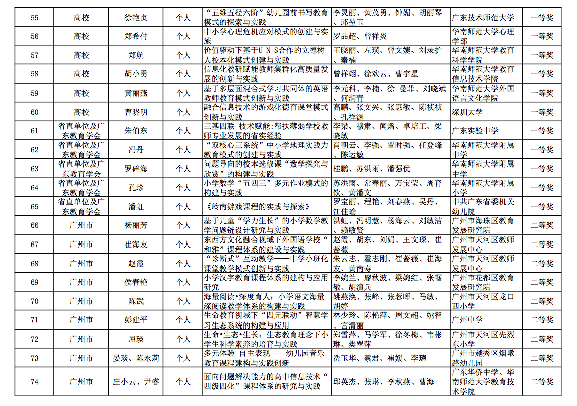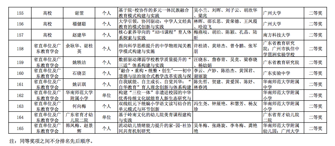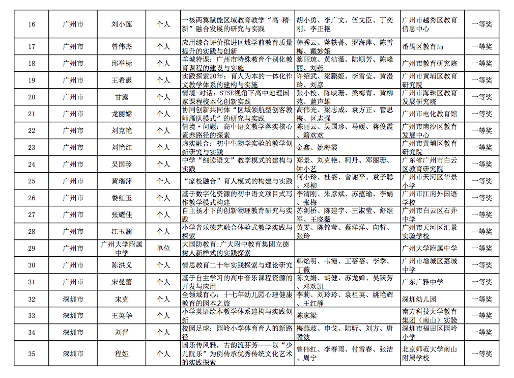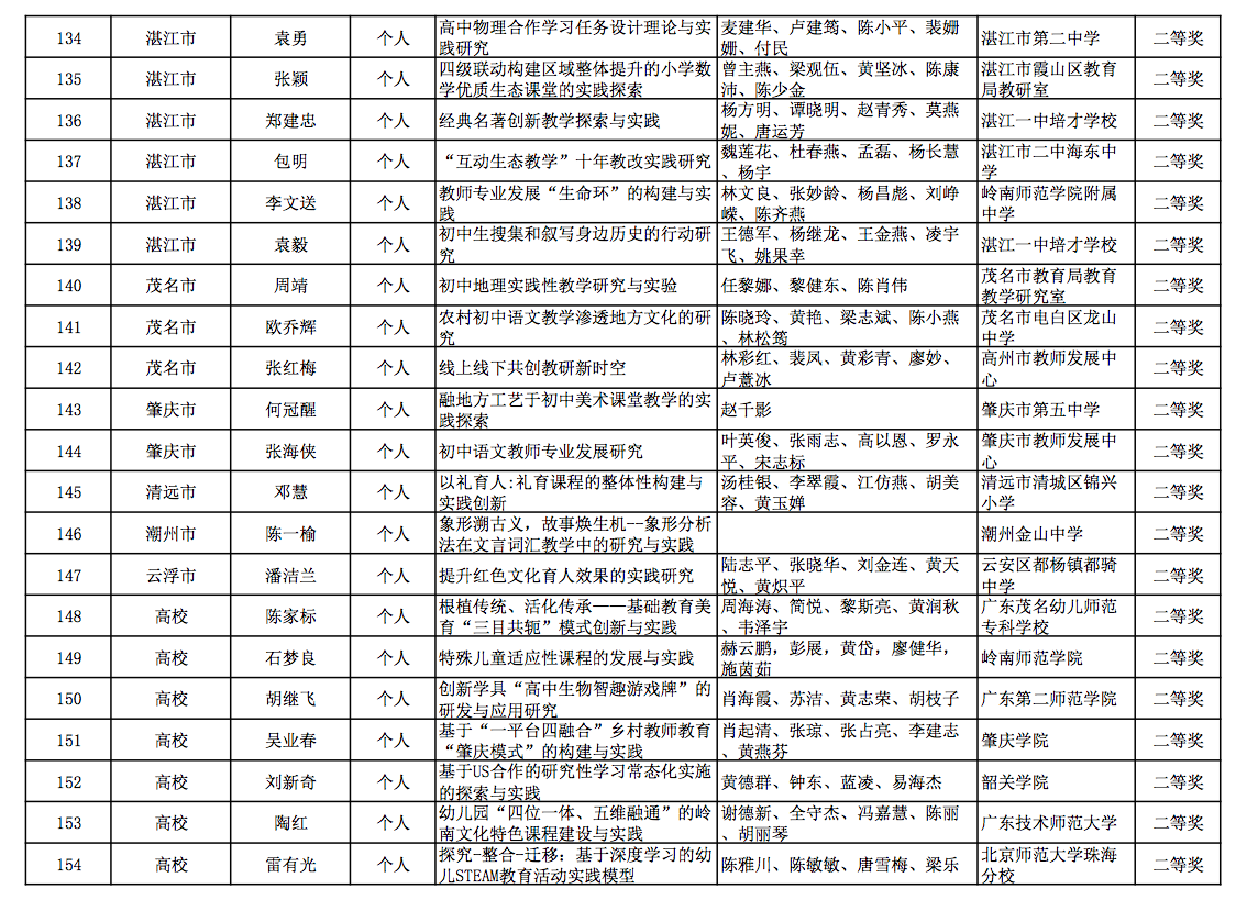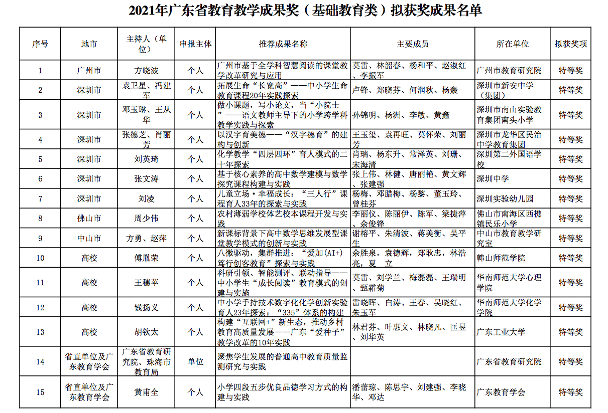 根据《广东省教育厅关于开展2021年广东省教育教学成果奖评审工作的通知》(粤教人函〔2021〕8号),经专家评审,共评选出基础教育类教学成果拟获特等奖15项、一等奖50项、二等奖100项,共165项,现予以公示。