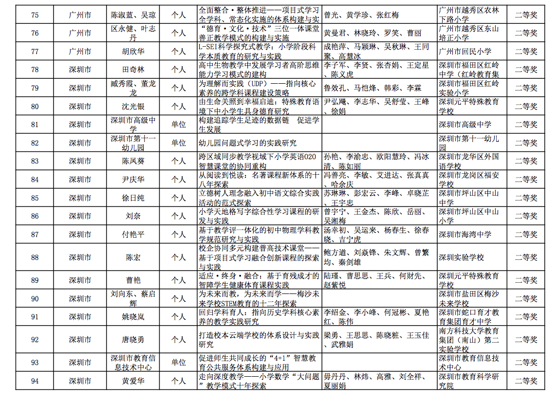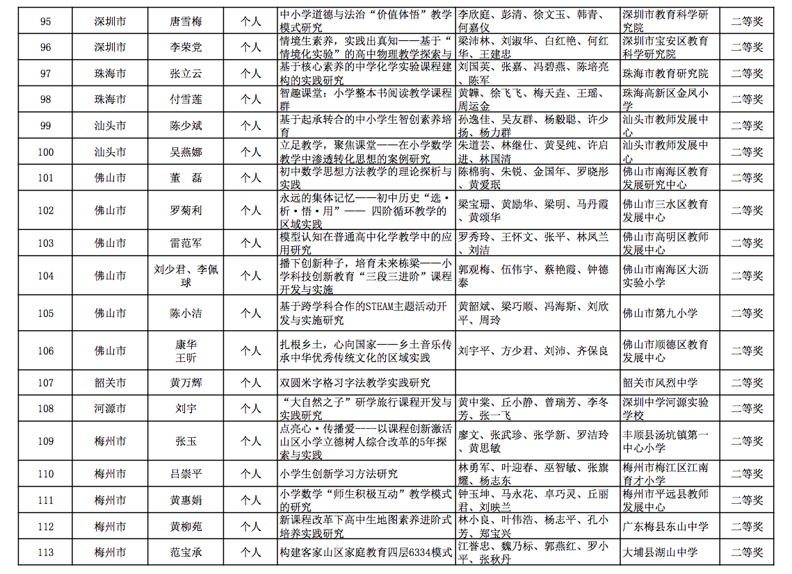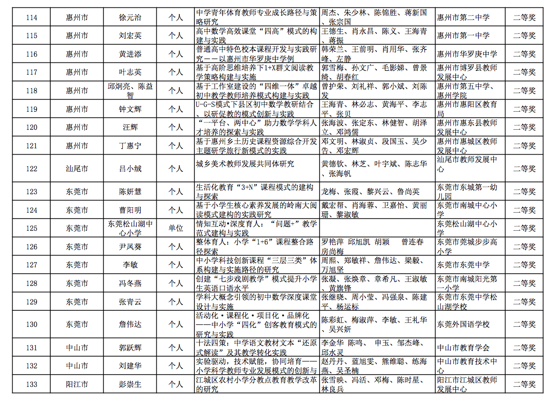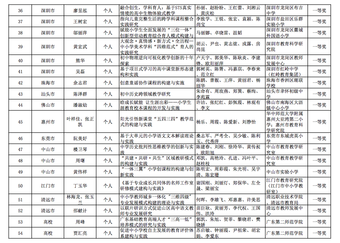 根据《广东省教育厅关于开展2021年广东省教育教学成果奖评审工作的通知》(粤教人函〔2021〕8号),经专家评审,共评选出基础教育类教学成果拟获特等奖15项、一等奖50项、二等奖100项,共165项,现予以公示。