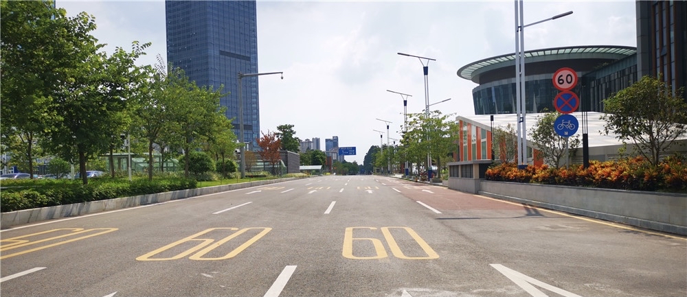 9月2日下午2时多,记者在汉溪大道万博商务区北半幅西行路段(万博二路至番禺大道段)看到,路面铺上了沥青,划分了交通标线、标识,路边就是地铁7号线、18号线南村万博站出入口。万博二路至万博一路路段设有4条机动车道(含公交专用车道),限时速60公里;万博一路至番禺大道段设置3条机动车道,限时速50公里。而早已开通的汉溪大道万博商务区南半幅东行路段也是4条车道。