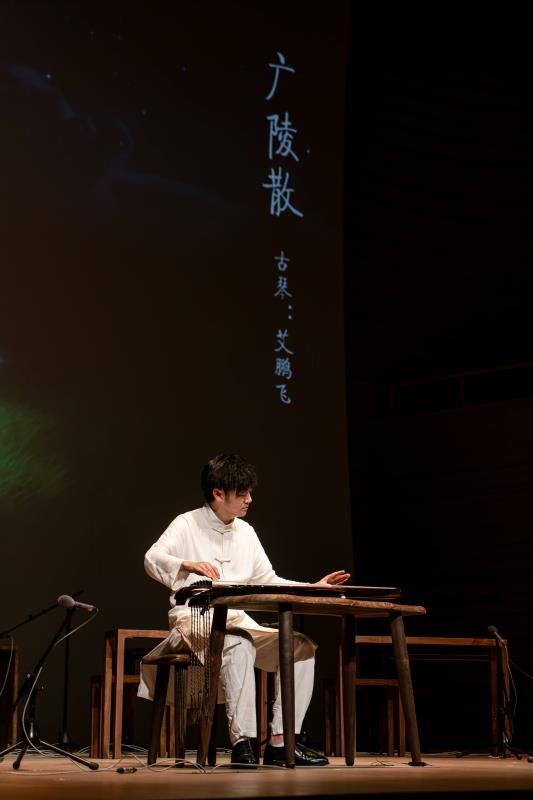 本场音乐会上演奏了《秋鸿》《广陵散》和《潇湘水云》三首传统古琴大曲,让古琴爱好者一饱耳福。提起古琴喻人,不能不提及传承我国现存古琴曲中唯一的具有戈矛杀伐战斗气氛的乐曲《广陵散》。《广陵散》音乐情绪时而悲壮激越,时而婉约动人,极富戏剧性对比,表现出深沉雄伟和庄严肃穆的大曲风范。王悠荻古琴艺术团现任团长艾鹏飞演绎这首荡气回肠的《广陵散》,个人风格增添了些潇洒气概,赢得现场的阵阵掌声。