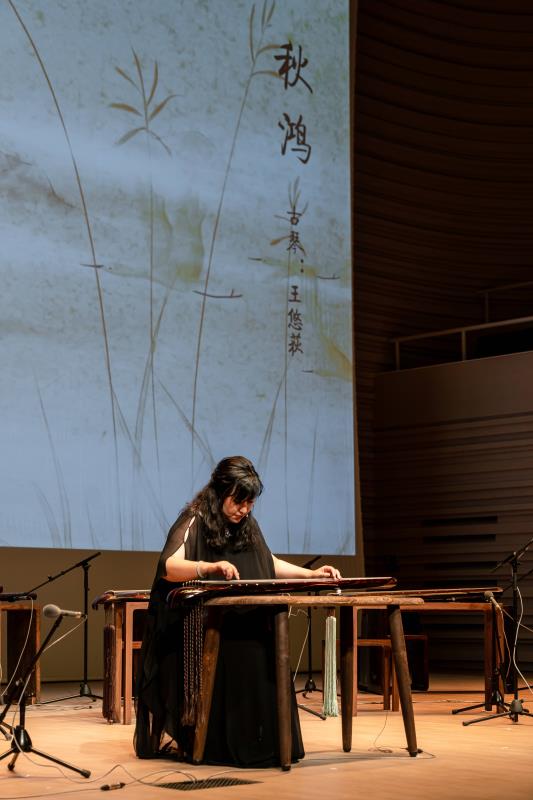 《秋鸿》旋律响起,宛如鸿雁振翅高飞,将人引入旷远高达之境,令闻者仿若从都市穿越至无人之地,一举万里。此曲以飞翔凌空的秋鸿为喻,旋律苍雄浑朴,节奏起伏跌宕,是继《广陵散》后篇幅最长的琴曲之一。该曲目也是王悠荻在博士学习期间重点研习的曲目。