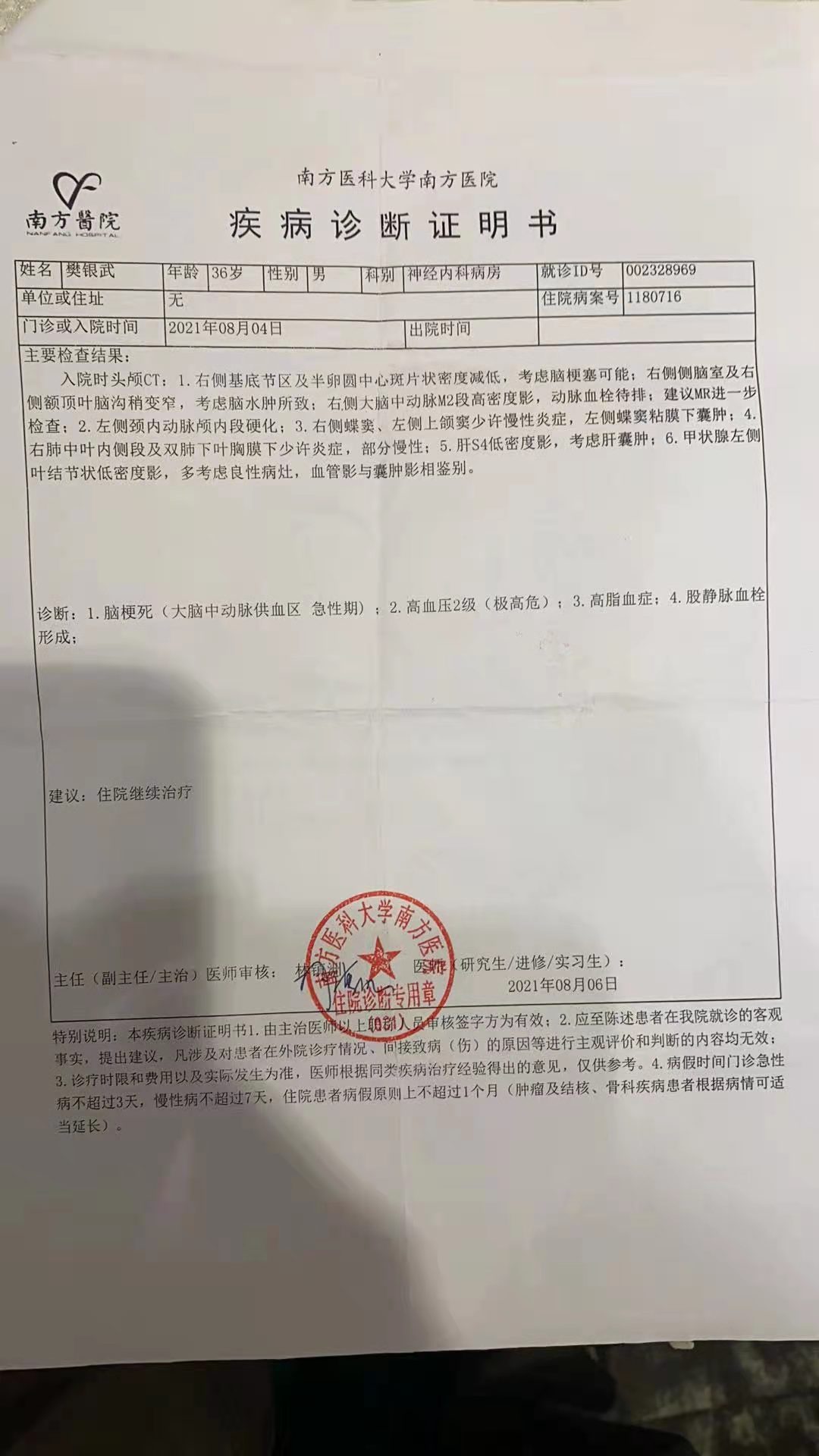 当小武到达南方医院神经内科病房时,他的症状已经十分严重,他的意识已经开始有些模糊。医院经过详细诊断后,小武的症状被诊断为多种重症的综合:脑梗死(大脑中动脉供血区,急性期)、高血压二级(极高危)、高脂血症、股静脉血栓形成。因为颅内出现急性血管堵塞,医生对他进行导管内支架溶栓治疗。对颅内血栓进行疏通后,最终将支架取出。