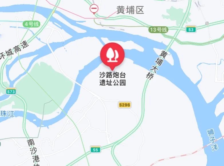 打开地图搜索“沙路炮台”,可以看到其位于化龙镇东北角的小山岗上。据介绍,沙路炮台遗址本体范围占地面积约21万平方米,共有9门西洋大炮,分布在濒临珠江的马腰岗及兵岗上,形成了一个倒“V”字形,完全贴合面前河道的转弯,对其形成完全的控制。