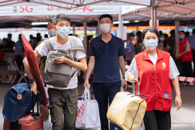“请提前扫描葵花码,填报个人信息”“请在这边排队,检测体温”……在迎新现场的各个地方,都有着穿着红色或黄色马甲的迎新志愿者,他们承担着人员指引、疏导人流、行李搬运、协助查验证件、体温检测等工作。