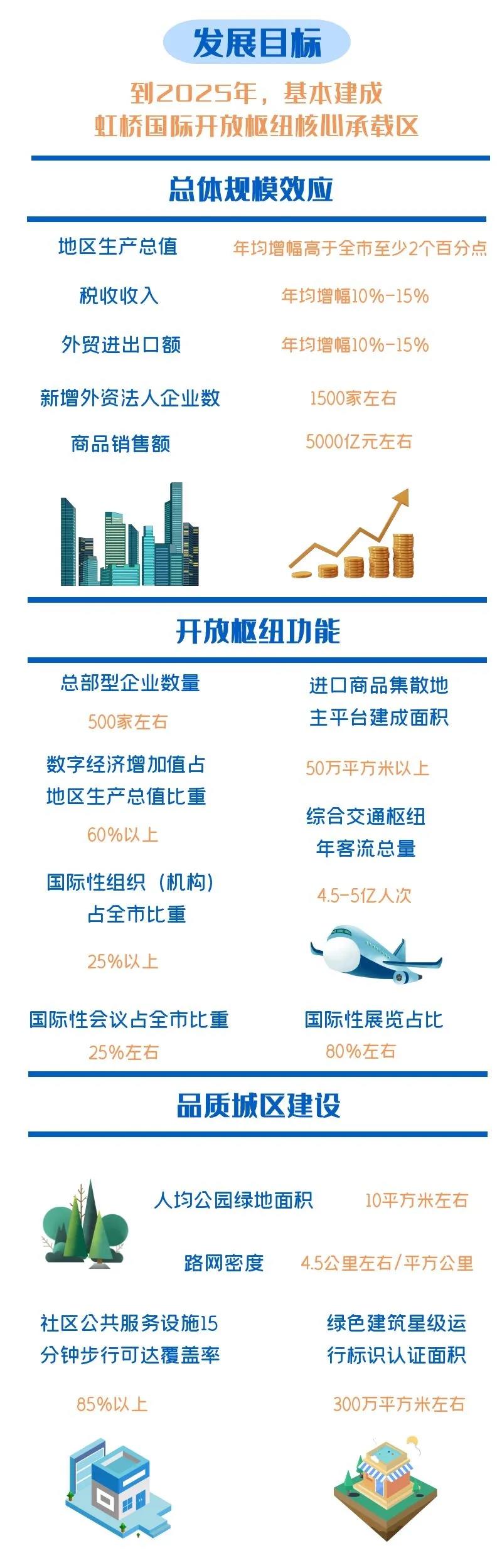 《规划》提出,到2025年,基本建成虹桥国际开放枢纽核心承载区。在高能级主体集聚、现代产业经济集群初显、带动区域经济高质量发展的引领力增强、核心功能显著提升的基础上,中央商务区和国际贸易中心新平台功能框架和制度体系全面确立,综合交通枢纽管理水平显著提升,服务长三角和联通国际的作用进一步发挥。