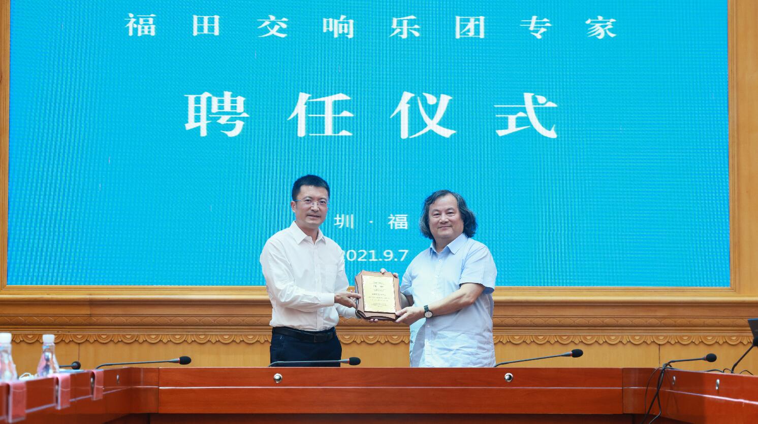 福田区委书记黄伟(左)为指挥大师汤沐海颁发福田交响乐团荣誉顾问聘书