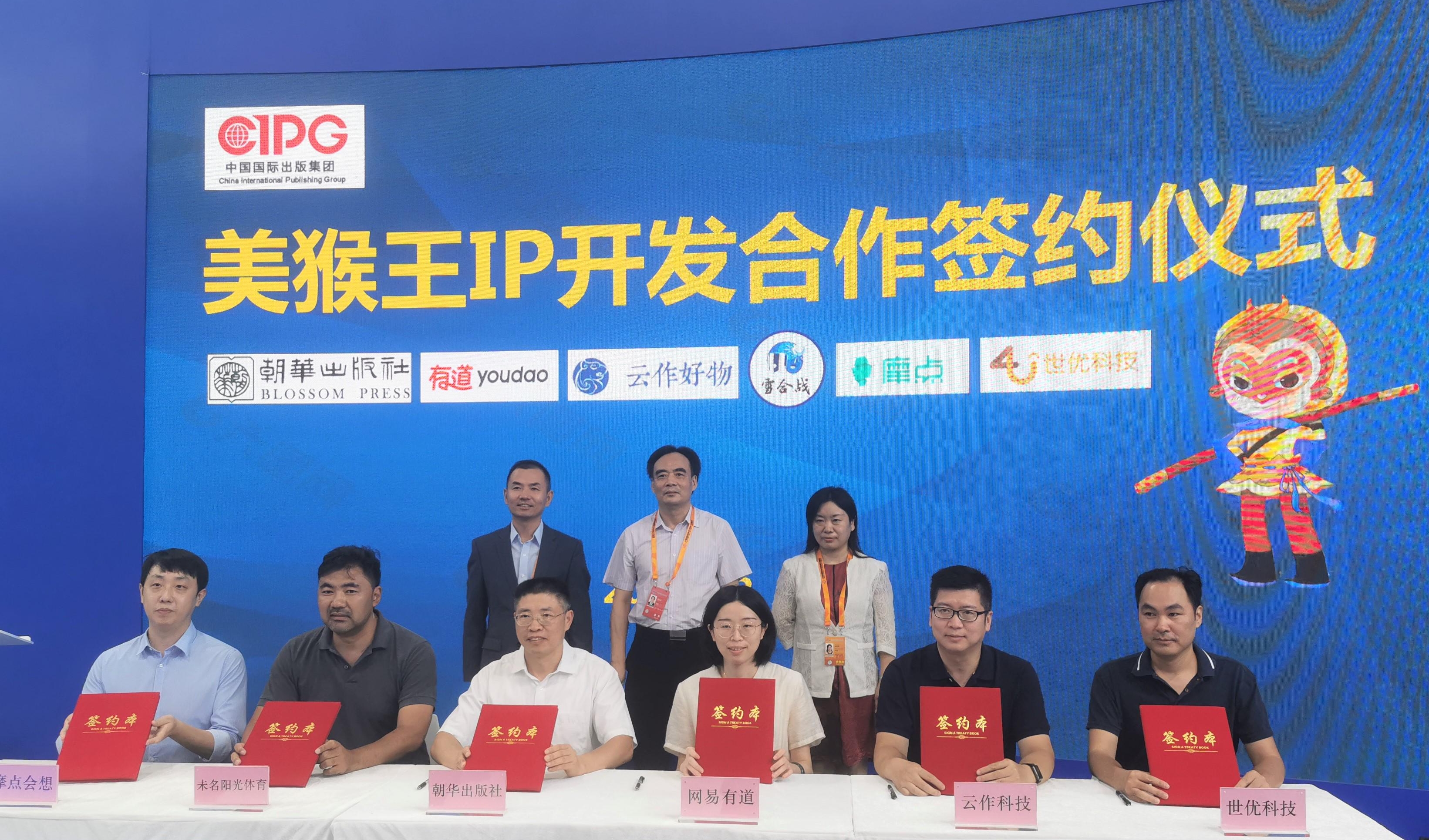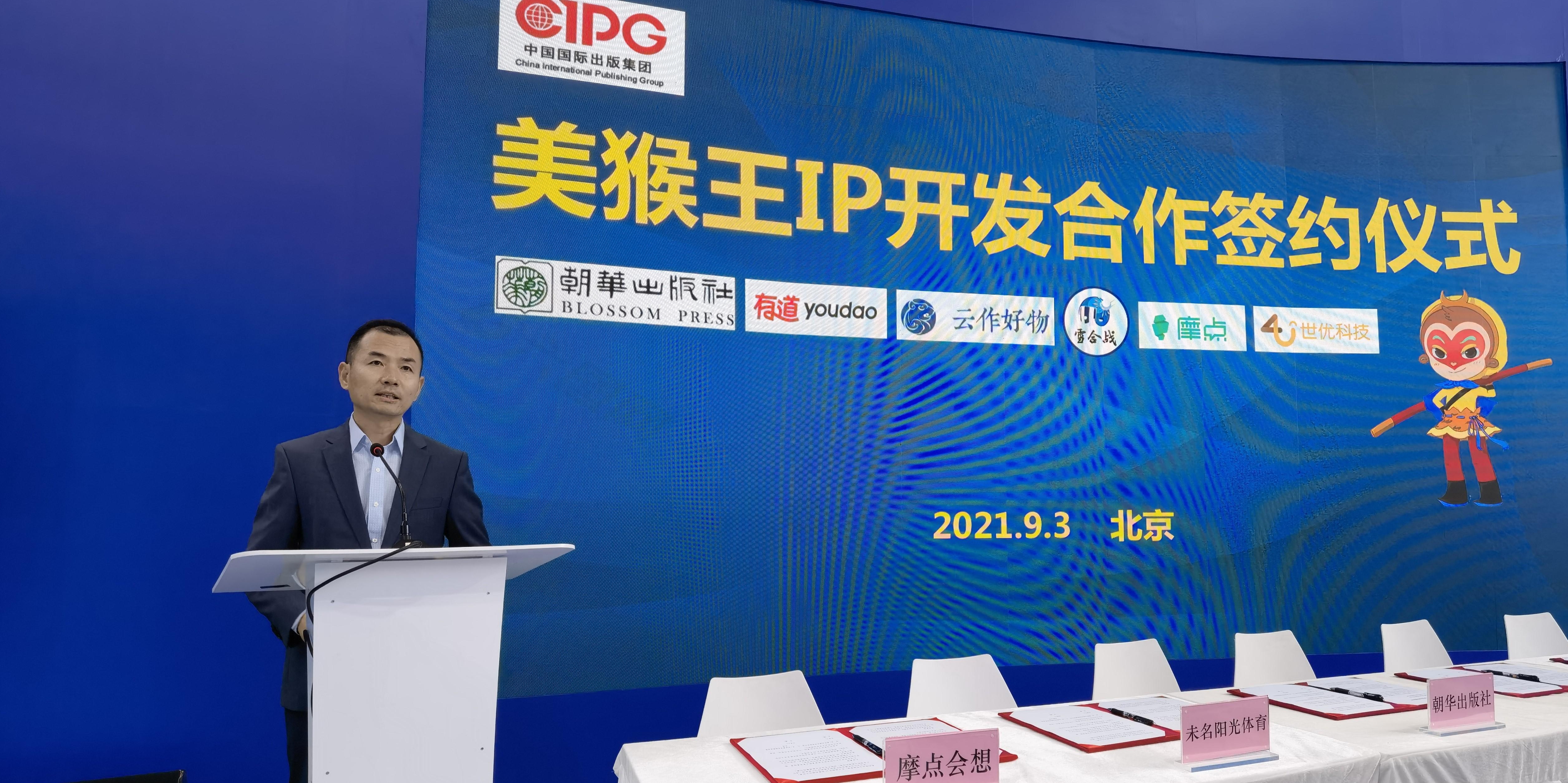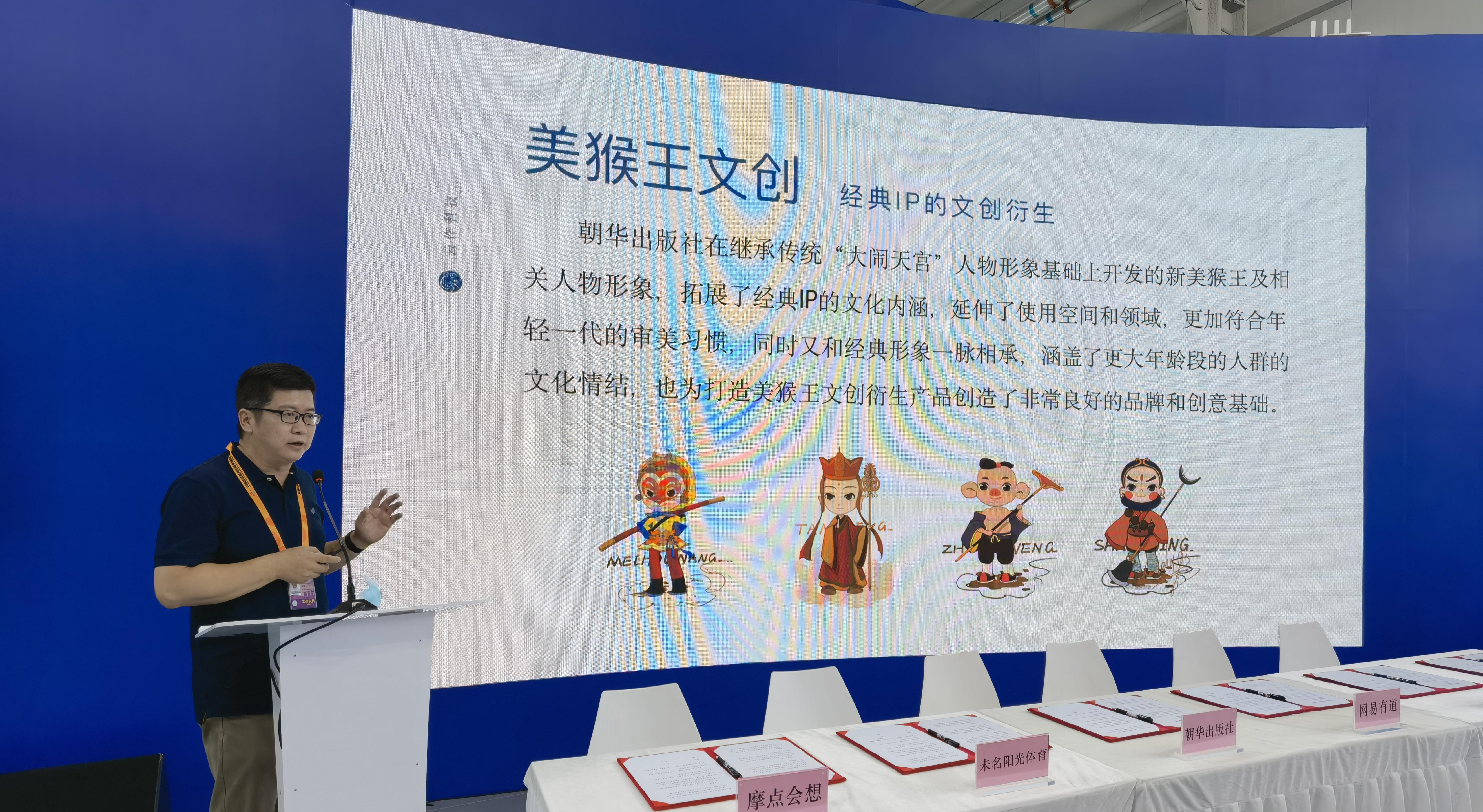 网易有道副总裁何皓瑜、北京云作科技有限公司总经理蔡超、北京未名阳光体育咨询有限公司总经理于国超、北京摩点会想科技有限公司商务总监金涛、世优(北京)科技有限公司总裁纪智辉等各机构代表从文创产品开发、IP数字化、创意活动和销售等角度,分别介绍了合作开发美猴王IP的目标和设想,并与朝华出版社副社长廖常军签约。