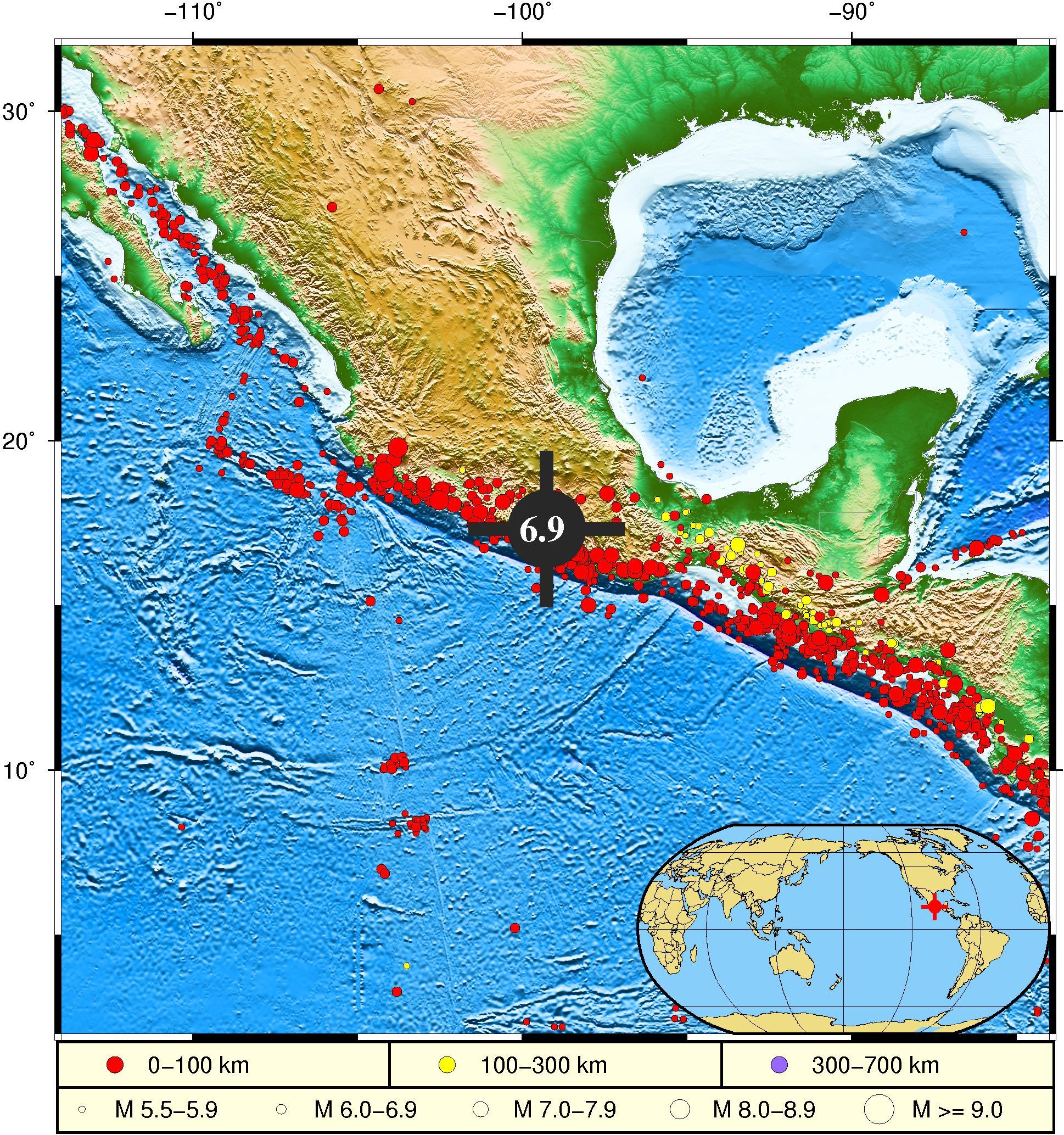 2021年9月8日9时47分(北京时间),墨西哥格雷罗州海域(17.31°N,99.27°W)发生6.9级地震,震源深度为15.0千米。自然资源部海啸预警中心根据初步地震参数判断,地震可能会在震源周围引发局地海啸,但不会对我国沿岸造成影响。