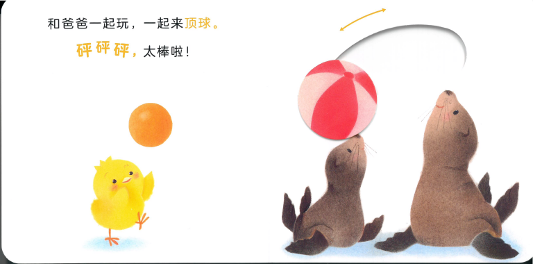 小鸡球球和小考拉拉大锯、企鹅宝宝踩在爸爸脚上走路、小火烈鸟和爸爸一起单腿站立、小海豚和爸爸一起游泳……快来和它们比一比,看看谁的动作做得棒吧!