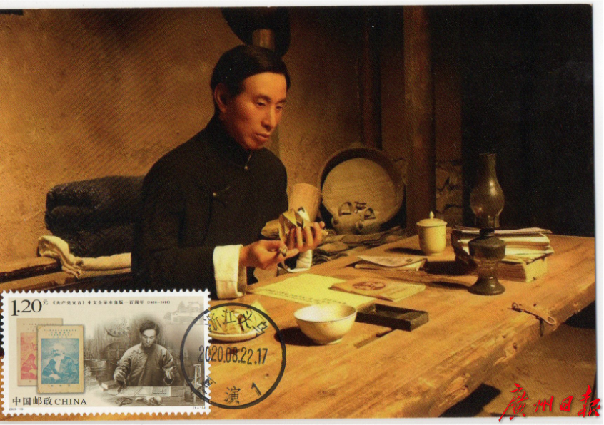 陈望道为中国共产党的建党工作奠定了理论基础,为马克思主义在全世界的传播做出了卓越贡献。2020年是陈望道先生翻译《共产党宣言》中文全译本出版100周年。为了纪念这段历史,中国邮政于2020年8月22日发行《〈共产党宣言〉中文全译本出版一百周年》纪念邮票一套1枚。该套邮票设计采用素描表现手法,生动细致地刻画出陈望道翻译《共产党宣言》时认真忘我的形象,完整展现了《共产党宣言》中文全译本翻译时的场景。