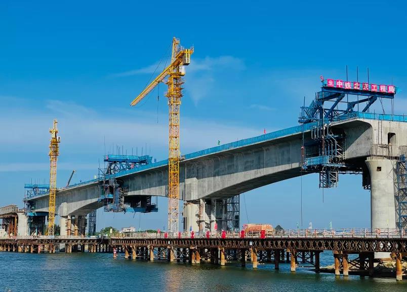 鳌江特大桥跨龙江连续梁位于惠来县溪西镇水口村,横跨420米宽的龙江,全长266.8米,与龙江河道夹角为22°。设计采用(70+125+70)米预应力混凝土双线连续箱梁,分为0号块、12个悬臂浇筑段、2个边跨合龙段,1个中跨合龙段,是架梁的重要通道,同时也是项目重难点控制性工程之一,安全风险大。对此,施工单位中铁北京工程局编制专项施工方案,采用菱形挂篮悬臂浇筑法施工,外侧模、内模为定型钢模,满足大跨连续梁的施工安全技术要求。