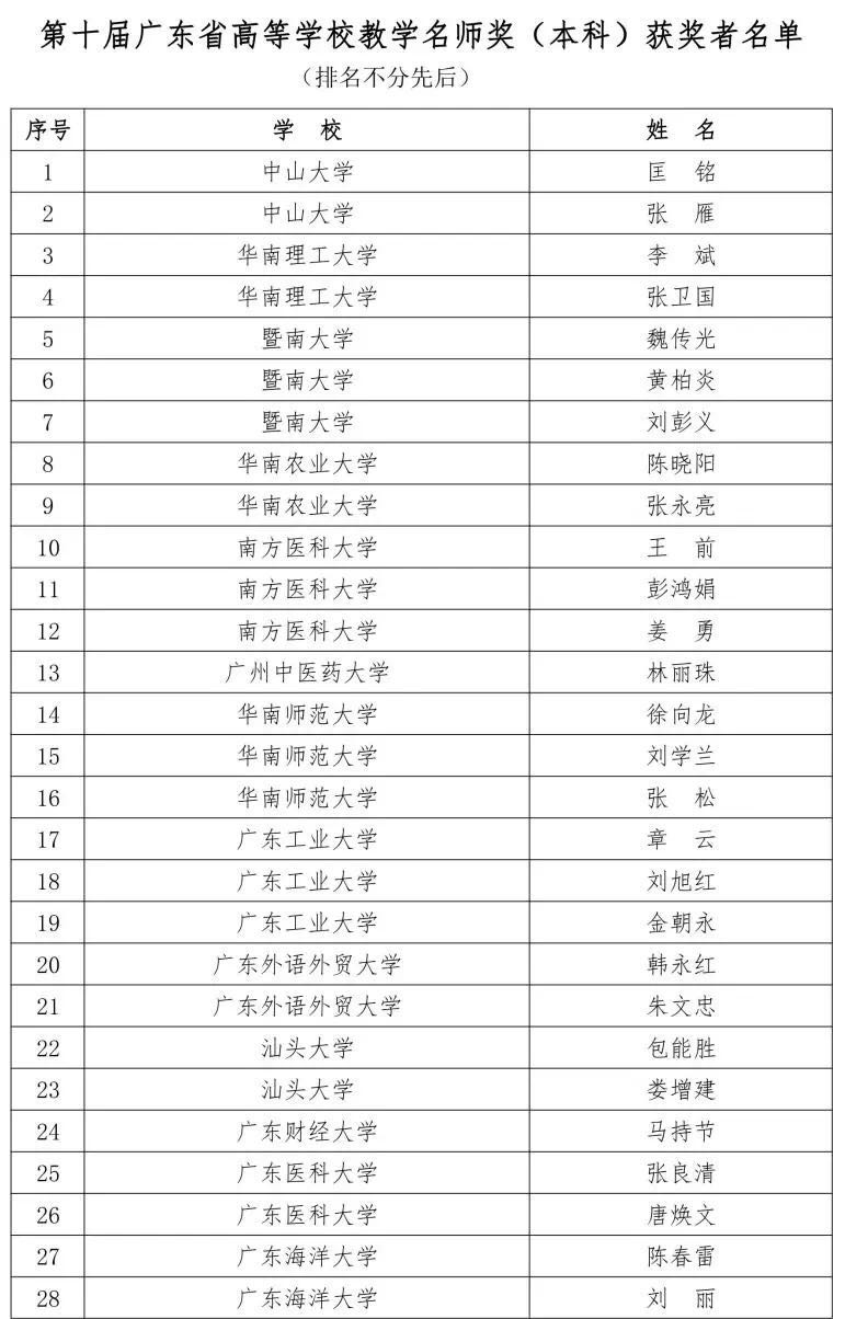 9月10日,广东省教育厅公布了第十届广东省高等学校教学名师评选结果。经学校推荐、资格审查、专家评审和公示,共59名教学名师获“第十届广东省高等学校教学名师奖(本科)”。