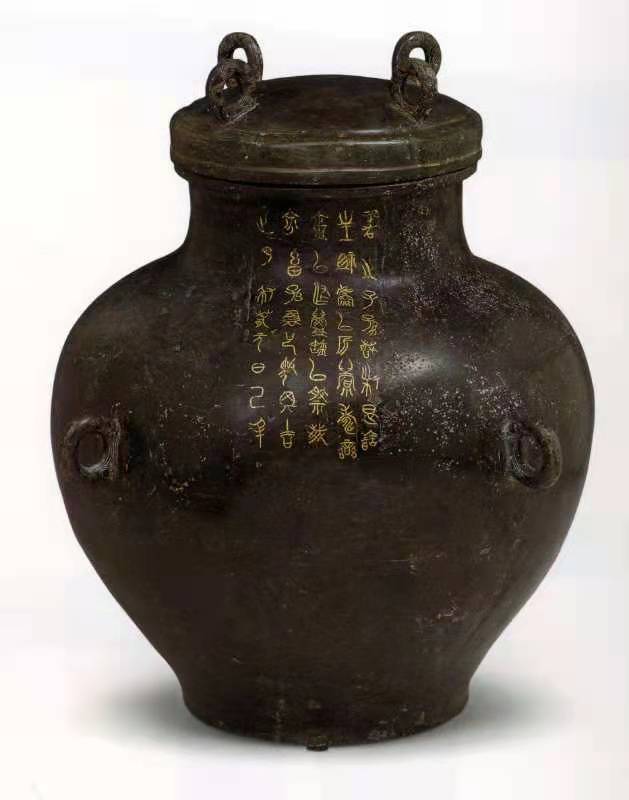 这件宝物是春秋时期器物,采用特殊工艺,在青铜器表面錾刻浅槽,在槽内嵌入金丝,再进行打磨。此缶盖内有错金铭文8字:“正月季春元日己丑”。器腹与颈部有错金铭文5行40字:“正月季春元日己丑,余畜孙叔也择其吉金,以作铸缶,以祭我皇祖,余以祈眉寿。栾书之子孙万世是宝”。此器为国家一级文物,现藏中国国家博物馆。