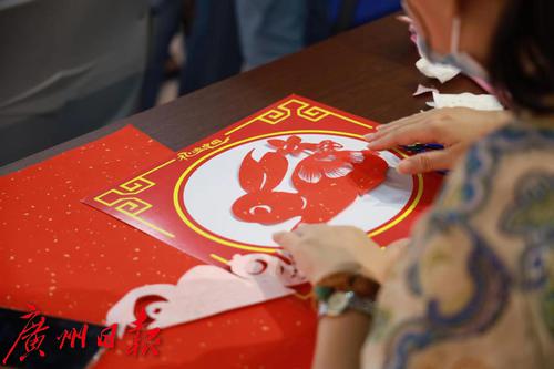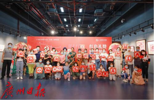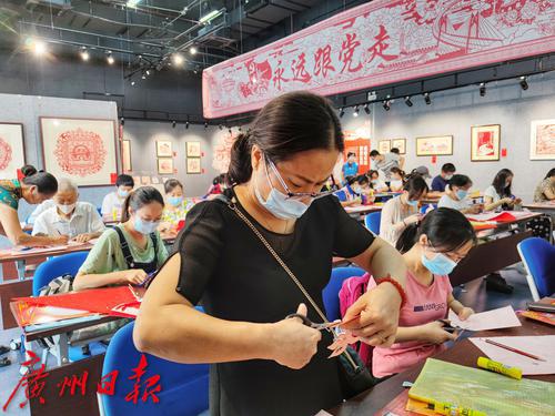 “剪画聪明胜剪书,飞翔花鸟泳濒鱼。任他二月春风好,剪出垂杨恐不如。”这是清代文人对剪纸艺术的高度赞赏。在古代,剪纸曾是家家户户逢年过节必不可少的节庆点缀,广东剪纸更是根植于岭南本土文化和民俗的民间艺术。正值中秋前夕,广东省文化馆(广东省非物质文化遗产保护中心)组织开展的2021年“在粤”系列活动首期展览“红色礼赞 纸寄初心——岭南剪纸艺术精品展”配套活动:“遥寄中秋梦,巧剪迎中秋”——剪纸体验课在广东省文化馆一楼展览厅开课,特邀本次展览参展艺术家剪纸项目广州增城区级代表性传承人何丹凤来到现场,指导市民朋友亲手裁剪中秋主题的剪纸,喜庆的红色剪纸作品为即将到来的中秋佳节烘托了浓厚的节日气氛。