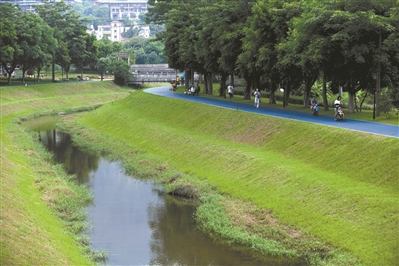 乌涌左支涌流域,附近居民扶老携幼在河段两旁的休闲步道上游玩歇息。微风轻抚着清澈的水波,两岸水草装点着绿道,令人心旷神怡。