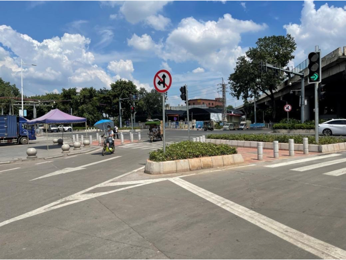 现在,交叉口增设非机动车道,北进口取消一条直行车道,增设非机动车道,并设置机非分隔护栏;适当加宽北进口东侧非机动车道并增设机非分隔护栏;路口非机动车等候区增设机非分隔护栏;交通秩序得到改善,整体运行情况良好,达到了治理目的。