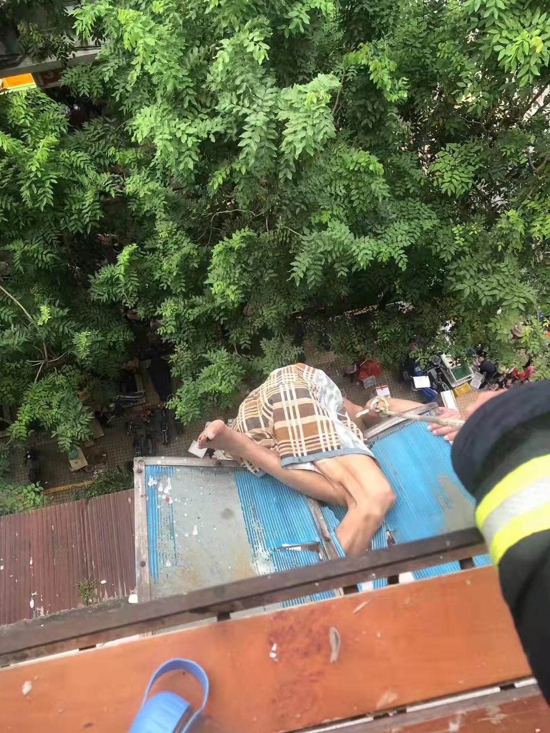 “我们到达现场后发现,一名老人悬挂在6楼和7楼间的外雨棚上,头朝下,腿部卡在雨棚上,随时都有坠楼的危险,情况特别紧急。”参与救援的消防员说,了解情况后,现场指挥员立即下达命令,在7楼抛绳索,让被困老人把手臂放进去,对其进行固定,防止老人因体力不支掉落。