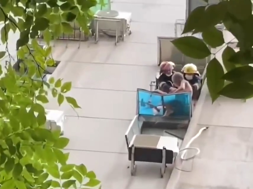 同时,2名消防员破拆6楼房间门,一名消防员做好防护措施后站在外阳台托举老人,将其扶正,并对老人进行绳索固定,防止雨棚受力不够发生坍塌。