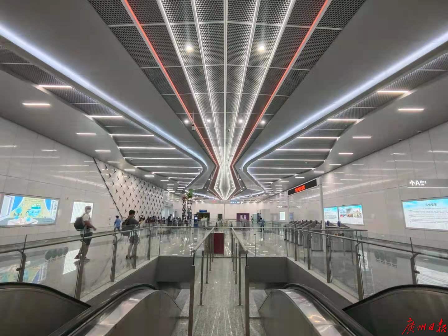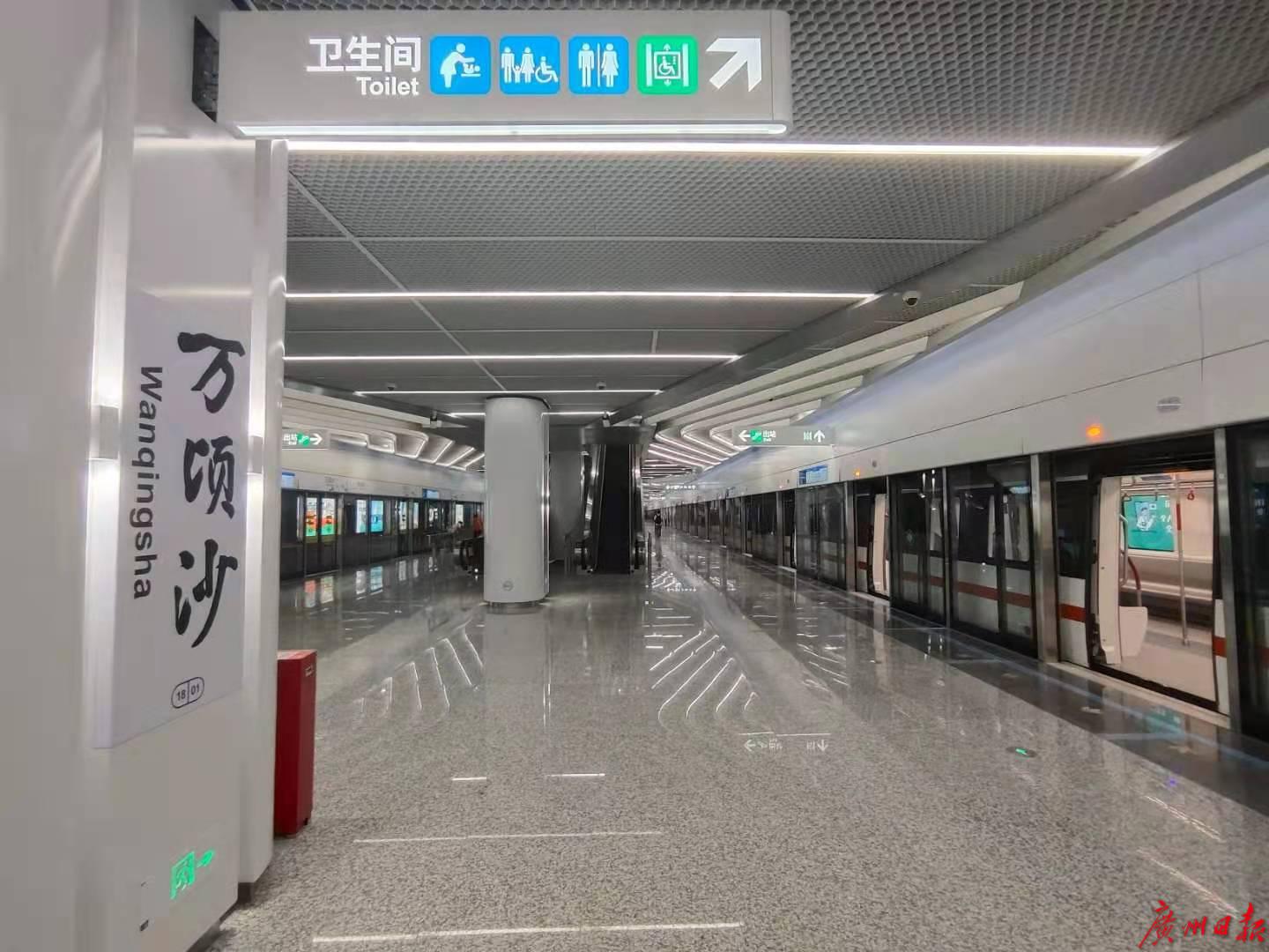 今天上午,18号线首通段(冼村-万顷沙)开放试乘,记者作为首批乘客登上快车,29分钟从冼村“飞到”横沥。之所以说“飞”,因为18号线分别开行快车和普通车,快车中途只停两站——番禺广场、横沥,“飞过”其他车站。