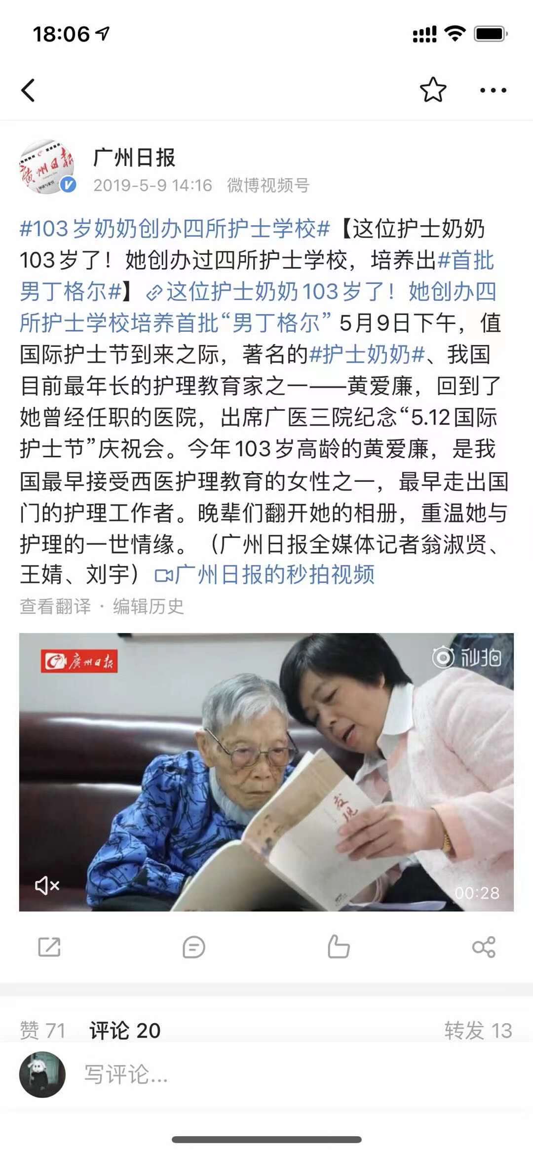 2019年护士节前夕,黄爱廉先生接受广州日报记者采访。