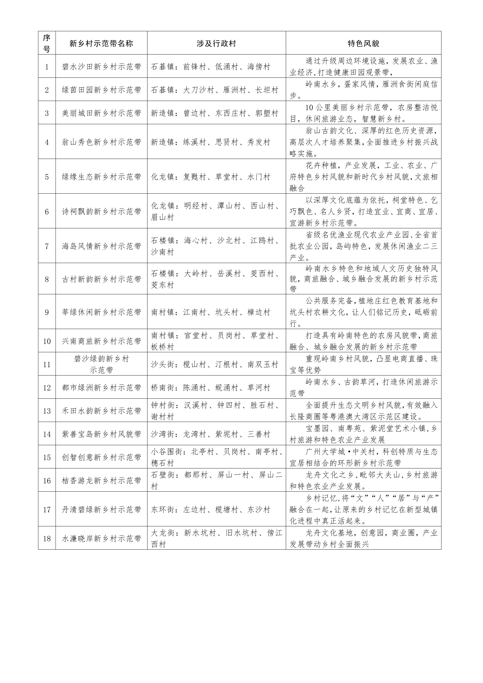 番禺区新乡村示范带基本情况一览表