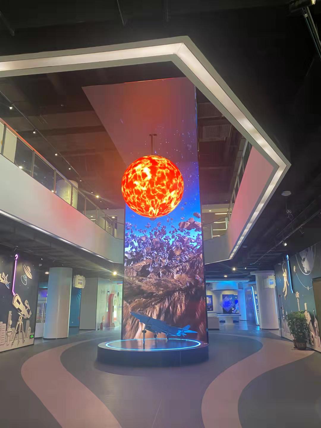 进入科普中心的中庭区域,威武霸气的歼20战机迎面而来,沿着战机直冲而上的是纵贯两层的LED巨幕和悬挂球幕,这三者联动构成了“开眼看世界”剧场,在强烈的视觉冲击中,观众可以追溯宇宙奥秘,了解地球历史脉络与今天国家的强大科技,甚至可以畅想未来发展到“星际文明”时,地球的科技发展究竟是怎样。
