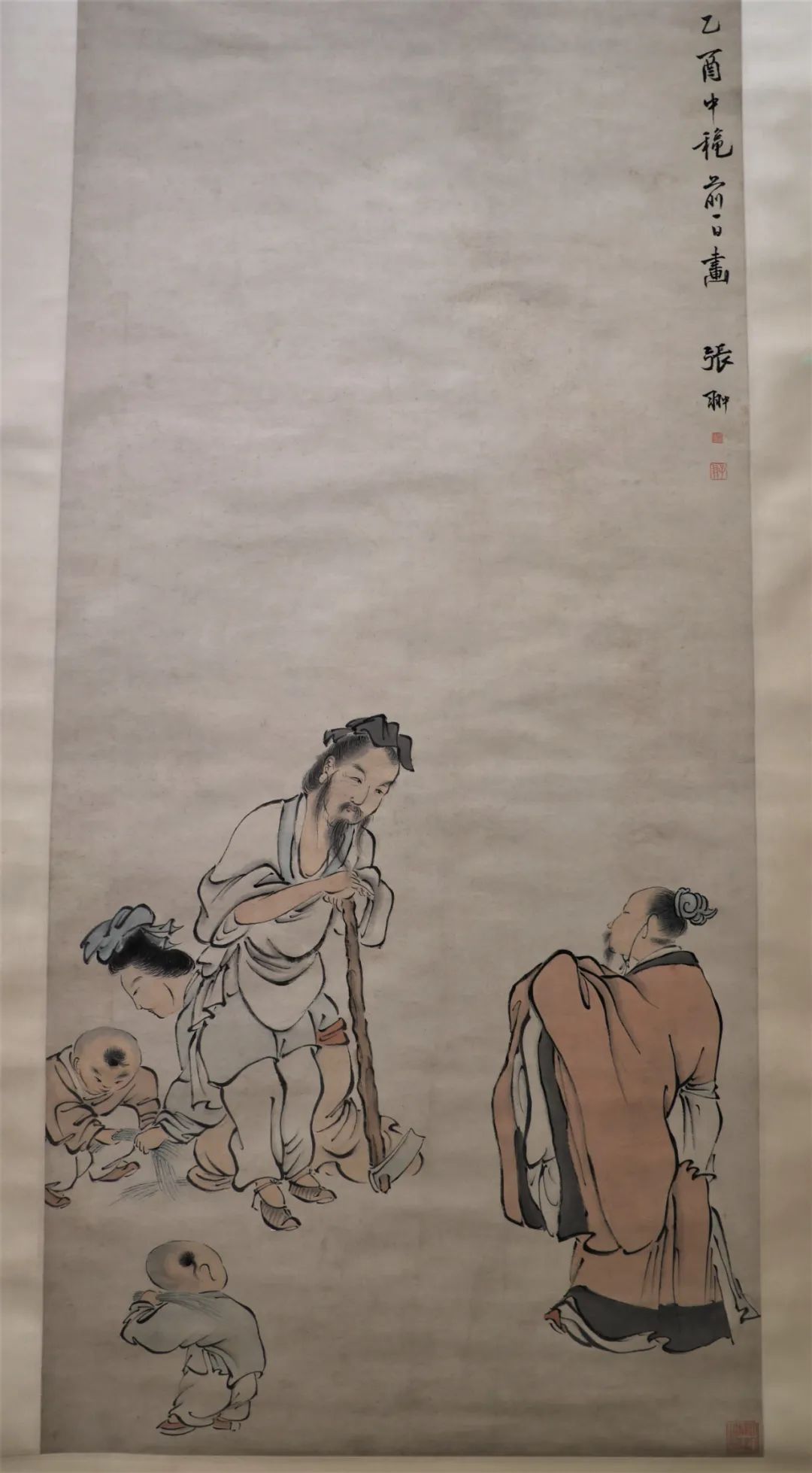 图中刘表作拱手躬身,谦恭下士之态。躬耕垄亩的庞德公手拄锄头,神情淡然地倾听刘表之言,妻儿在整理秧苗。人物形象清俊,用笔劲率,略有“浙派”遗风。