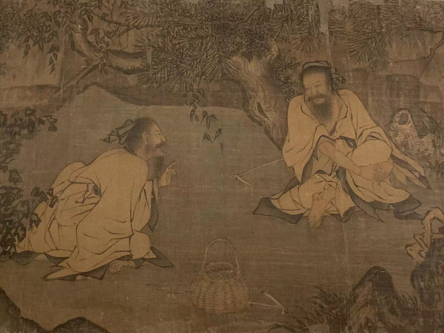 画面中描绘的是二人在林泉间席地对语,他们粗服草履,面容清瘦,地上放置了篮筐、锄头。人物面部形象生动,线条柔和,设色清淡,衣纹则简劲顿挫,灵动概括。树石则用笔粗率苍劲。