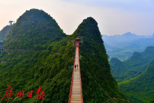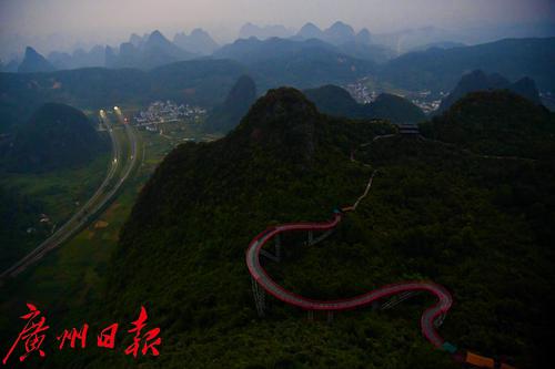 当游客漫步玻璃栈道,可以360度全方位纵览独特的喀斯特地貌,身临其境地欣赏到独有的阳朔秀美风光,颇具“人在画中游”之感。