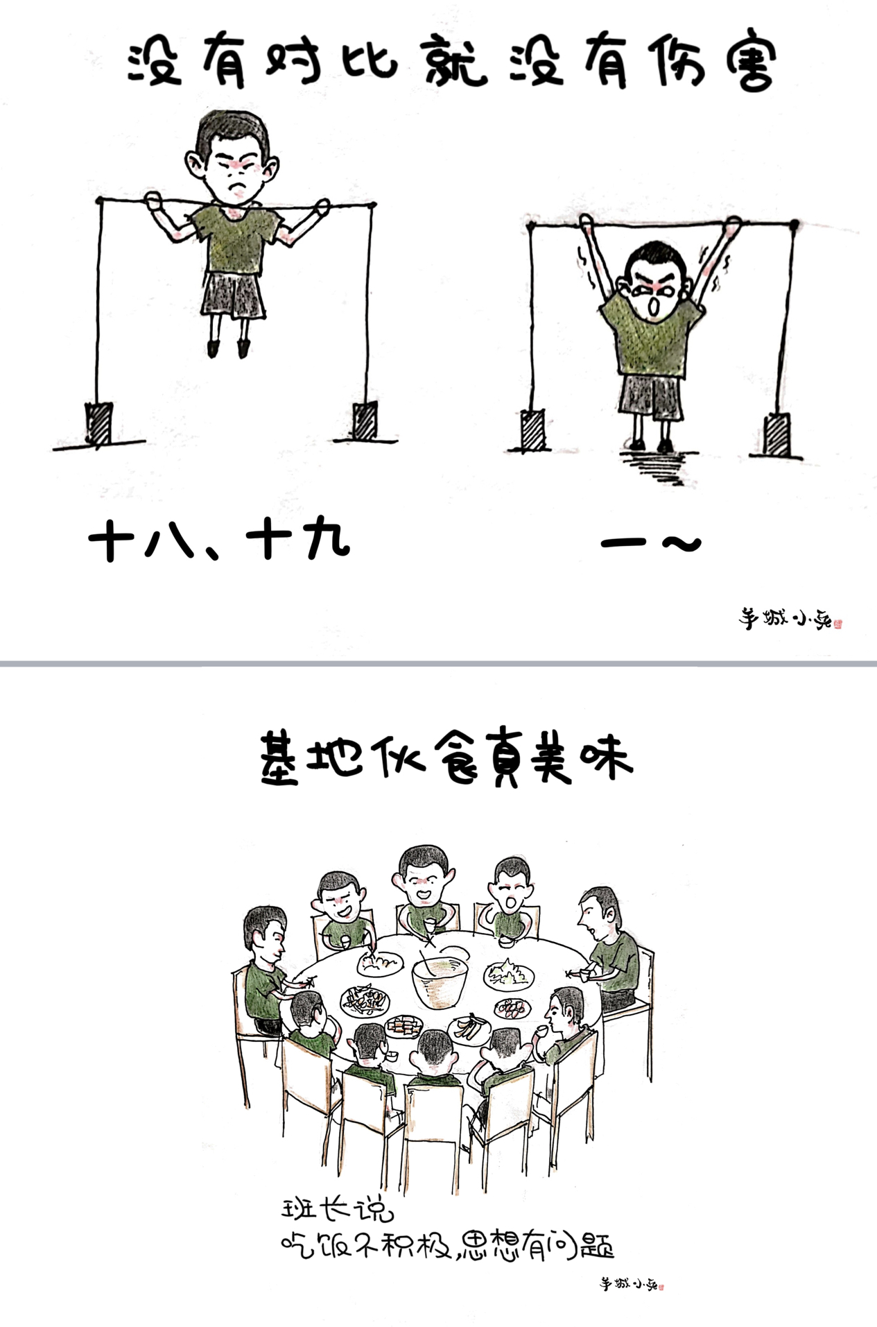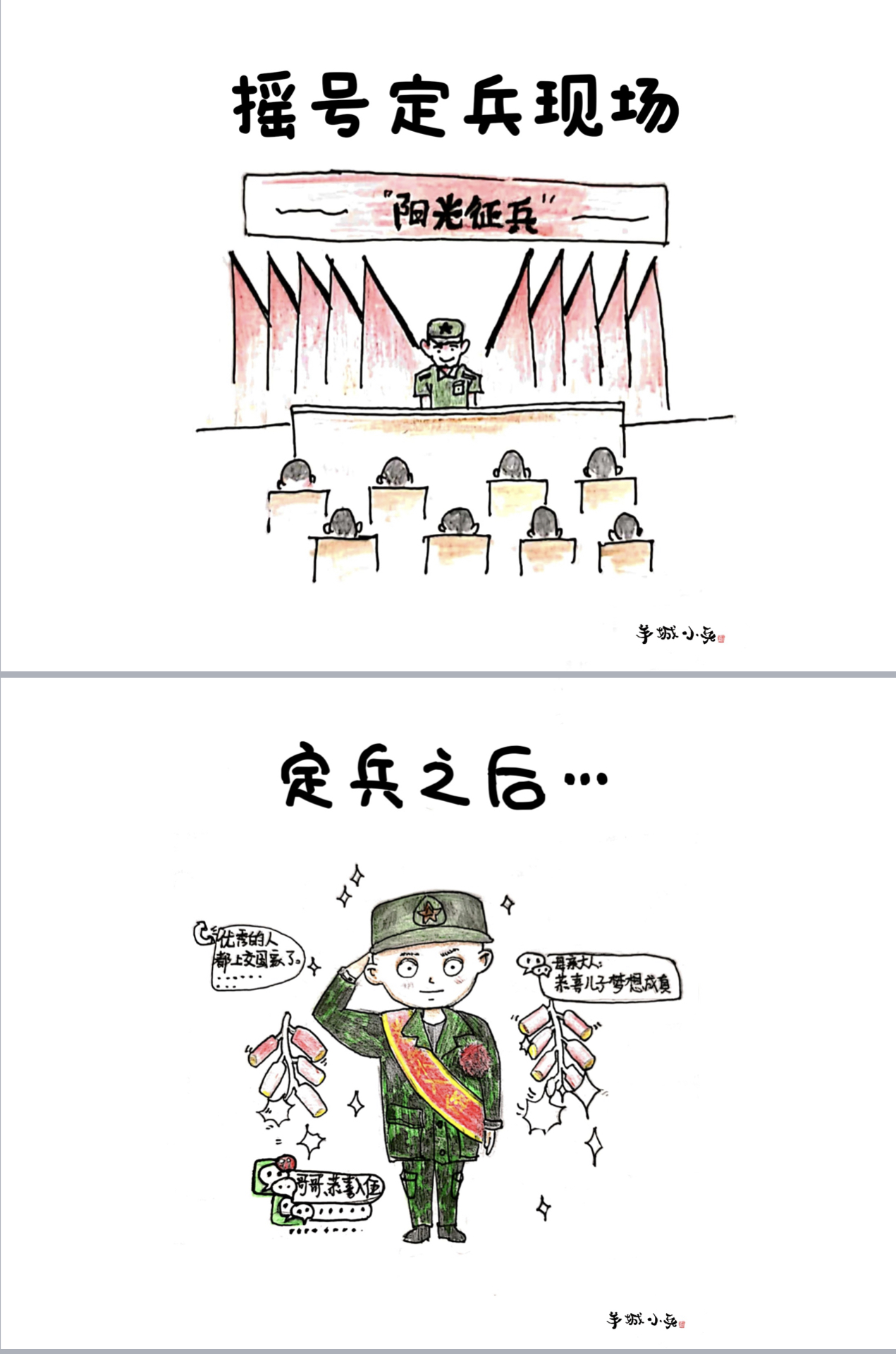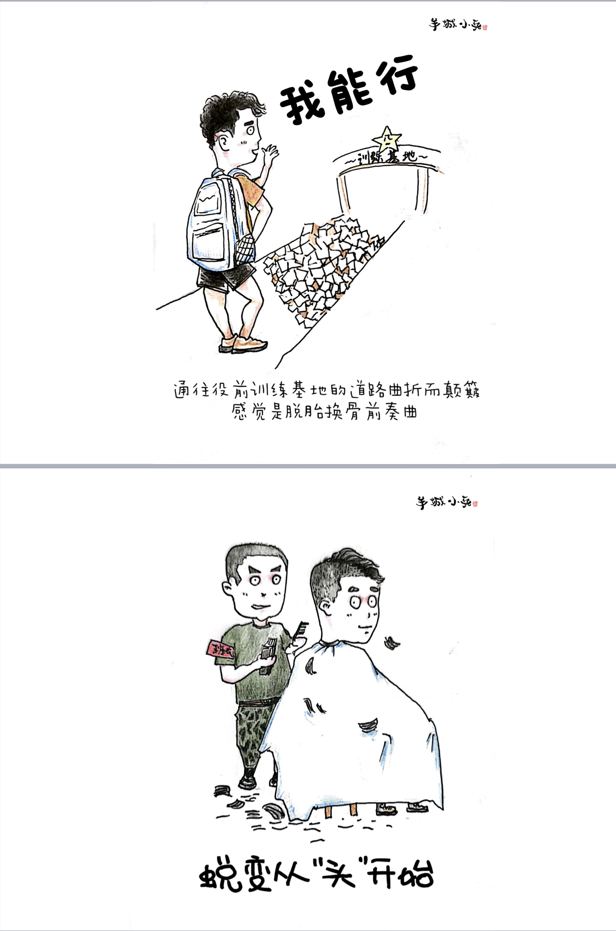 “蜕变从‘头’开始”“报告班长,我想上厕所”“班长说最后一名加五圈”“投弹,用上吃奶的劲啦”“没有对比就没有伤害”的引体向上……梳理出故事线后,他们根据选题,分工合作完成文案和插图。十几天的役前教育训练帮助“准新兵”系好在军旅生涯中的第一颗扣子。一幅幅跃然纸上的漫画也见证了他们三人的成长和蜕变。