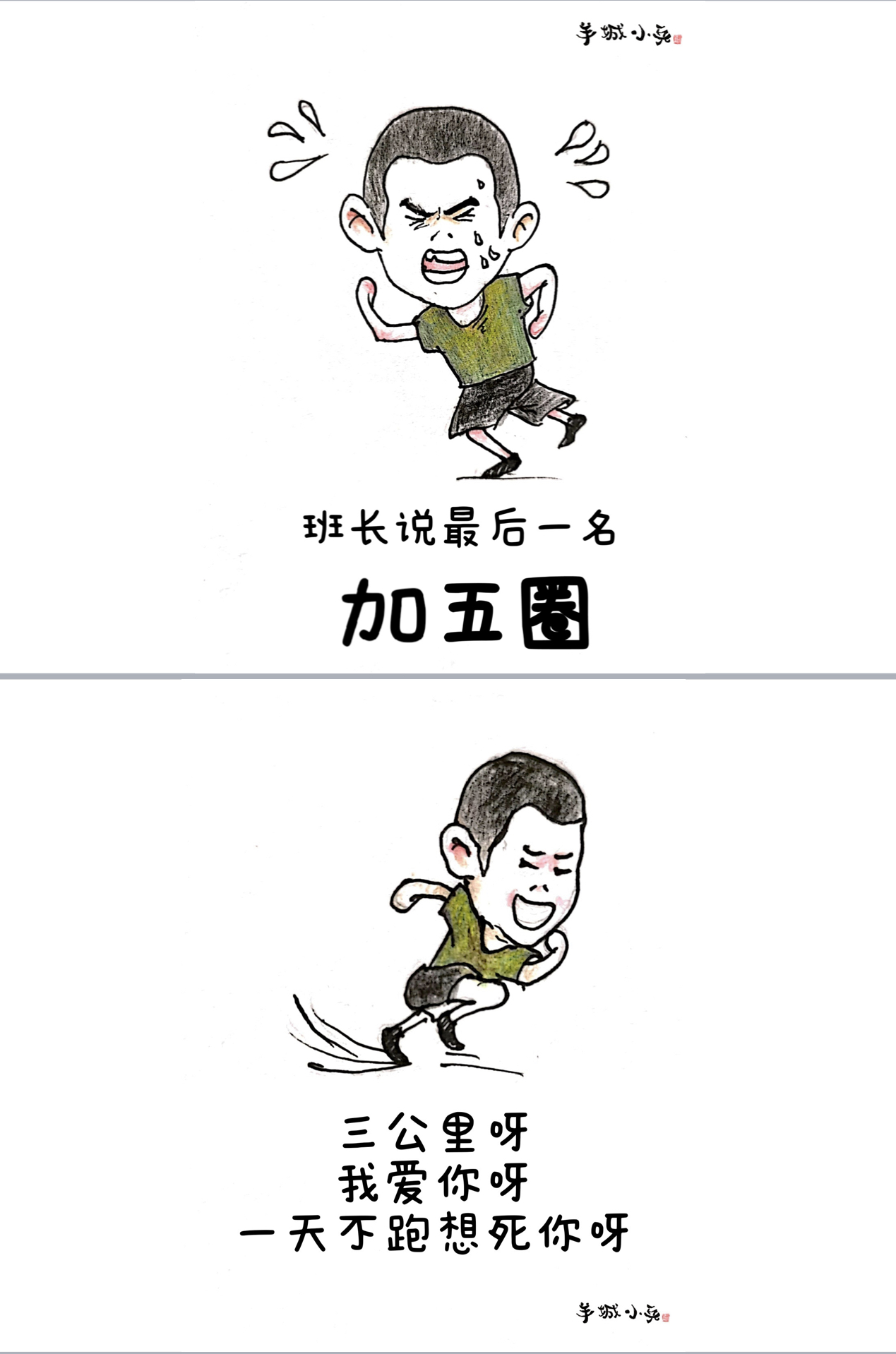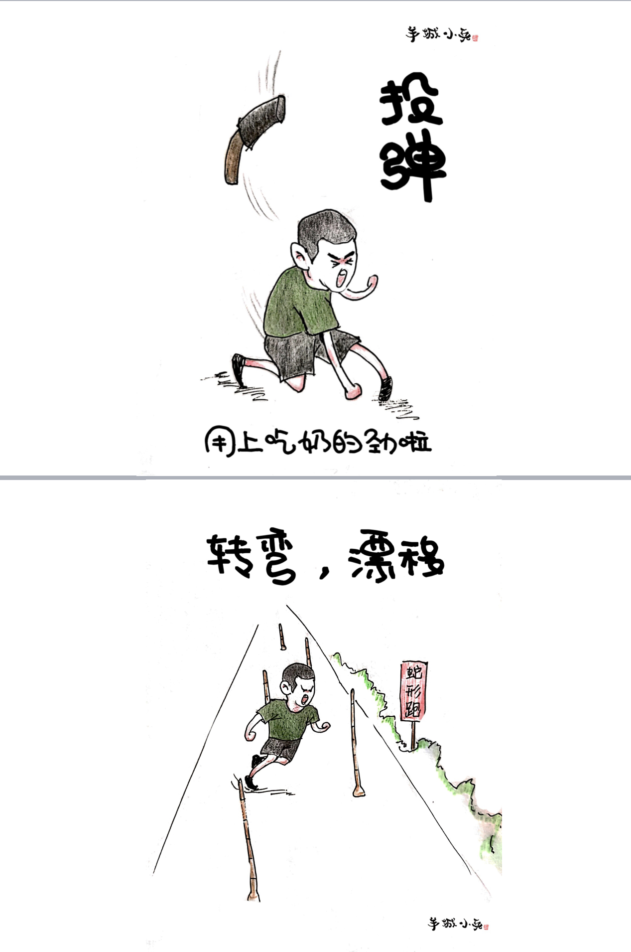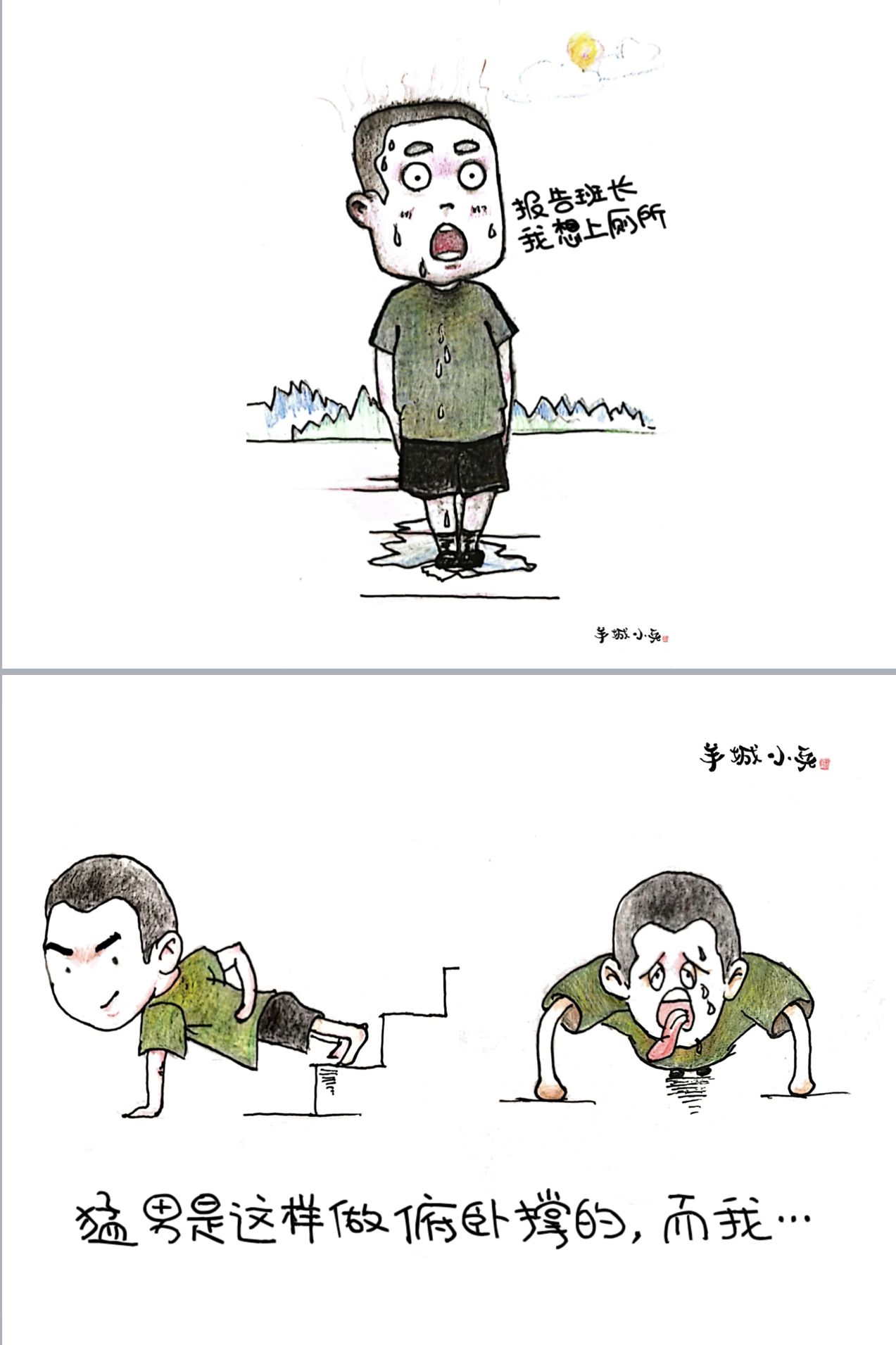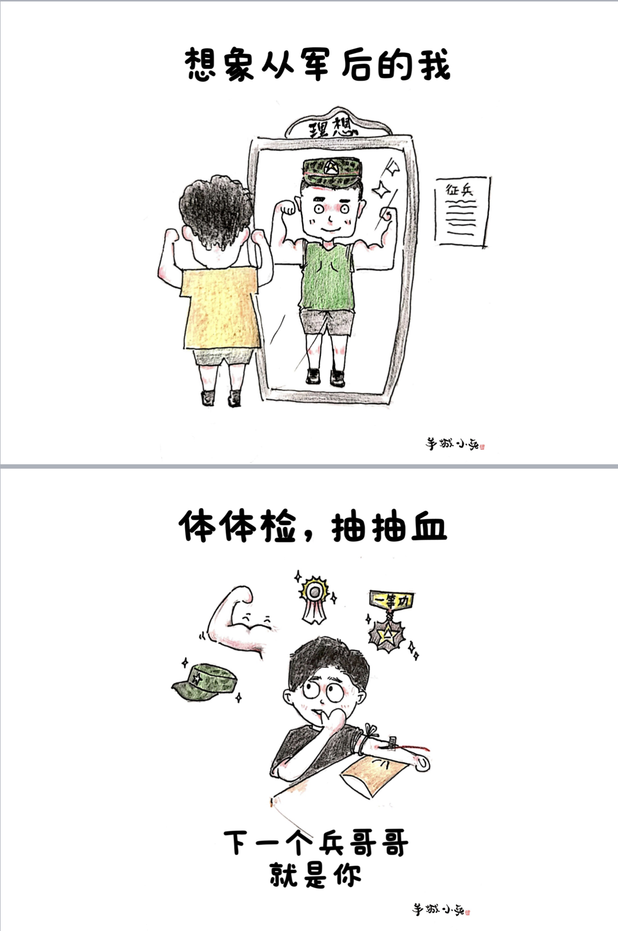 “蜕变从‘头’开始”“报告班长,我想上厕所”“班长说最后一名加五圈”“投弹,用上吃奶的劲啦”“没有对比就没有伤害”的引体向上……梳理出故事线后,他们根据选题,分工合作完成文案和插图。十几天的役前教育训练帮助“准新兵”系好在军旅生涯中的第一颗扣子。一幅幅跃然纸上的漫画也见证了他们三人的成长和蜕变。