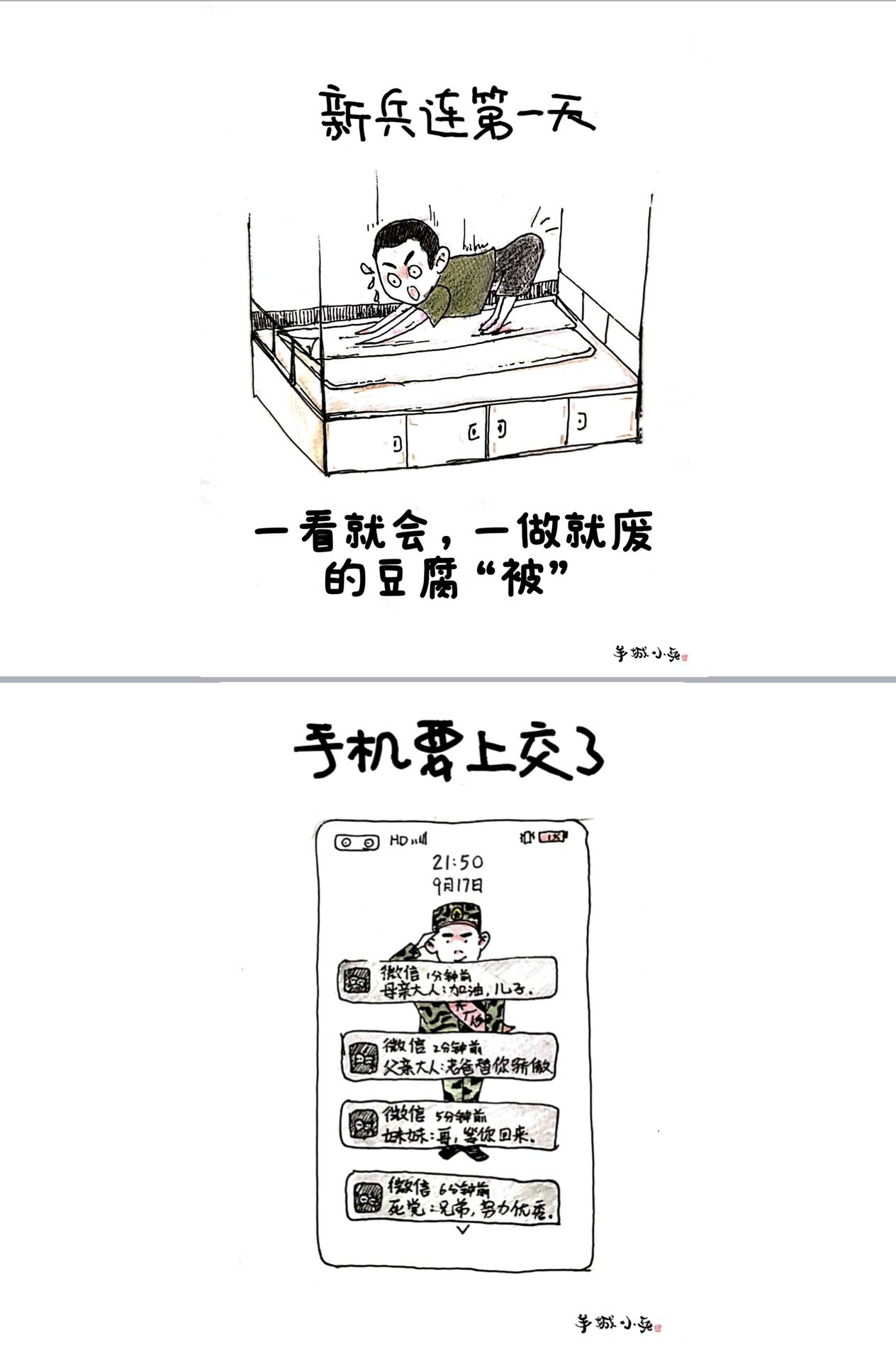 “手机要上交了”,是《羊城小兵从军记》中最后一幅漫画。“加油,儿子”“老爸替你骄傲”“哥,等你回来”“兄弟,努力优秀”……漫画中的手机满屏幕都是来自亲朋好友的祝福,因为祝福和鼓励太多,手机电量仅剩下1%。而此时,时针指向9月17日21时50分。再过10分钟,熄灯,新兵连的第一天就要过去了。