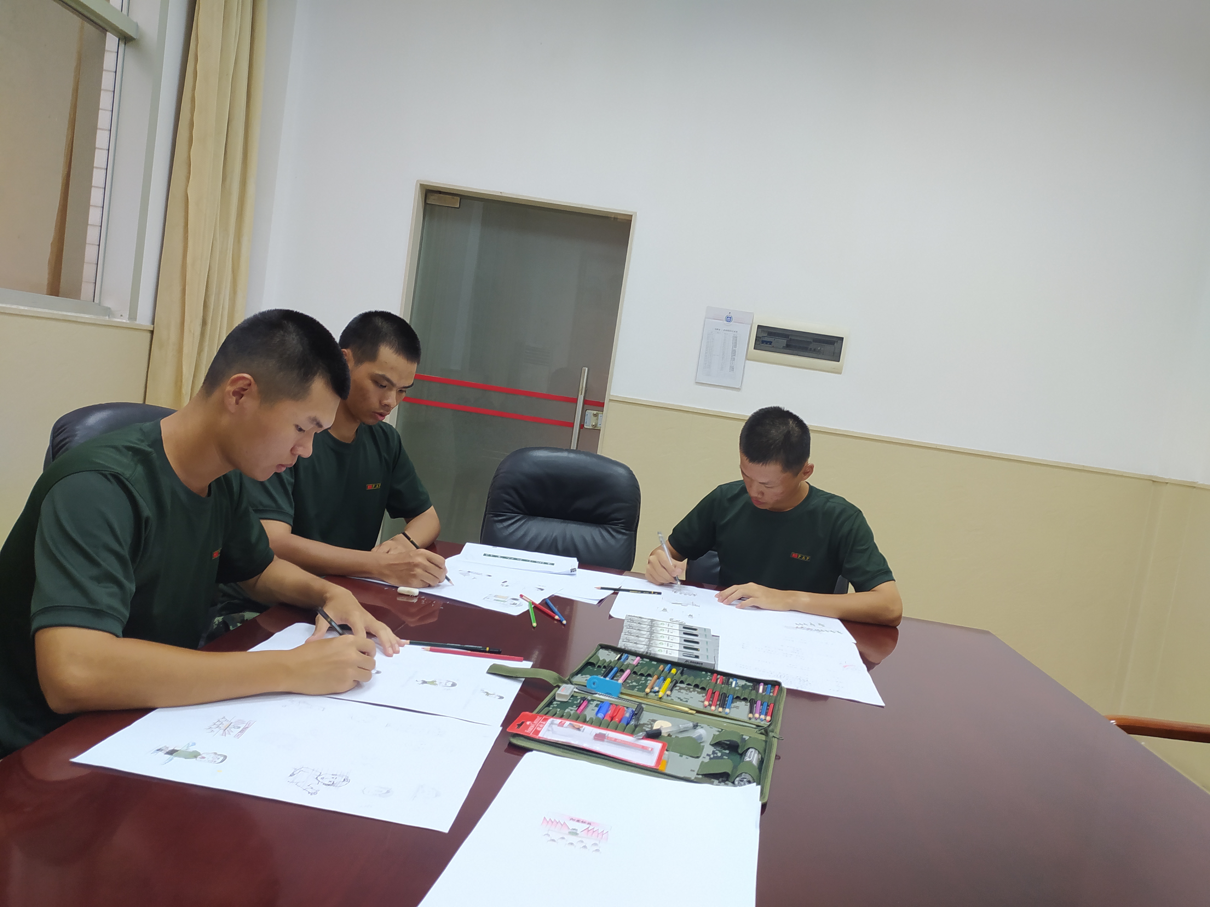 9月4日,他们前往广州市番禺区国防教育训练基地报到,开启了近两周的役前教育训练,也收获满满。“从报名到定兵一路‘过关斩将’,再加上奔赴军营的点滴,我们想用不同的方式记录下来。”彭绍轩说,他们选择手绘漫画,是想用轻松诙谐的方式让年轻人对从军有新的认识和感触。“我们三个专业分别是雕塑、工业美术和产品设计,也算是发挥专业特长吧,大家一拍即合,利用训练间隙开始创作。”