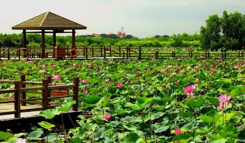 九曲莲花桥因木栈道九曲而得名,建在九曲莲花池上,是湿地夏季看点“夏赏荷叶田田”之处。南沙湿地的荷花池区域共约100亩,均为颜色鲜艳的粉色观赏荷。