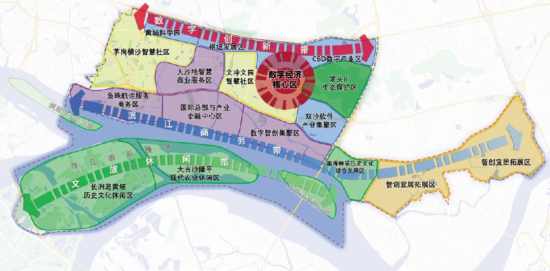 《规划》提出,全面融入广州市“一区三城”和黄埔区、广州开发区“一岸双轴三片”格局,在黄埔临港经济区和广州人工智能与数字经济试验区(鱼珠片区)构建“一核三带多点”的高质量发展空间格局,建设以人工智能为引领、以数字技术为驱动、以信创产业体系和现代服务业产业体系为支撑、宜居宜业宜游的全球智慧创新港城。