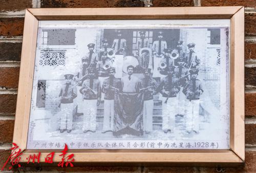 广州市培正中学银乐队全体成员在红砖小楼“青年会”前的合影( 山中为冼星海,1928年)