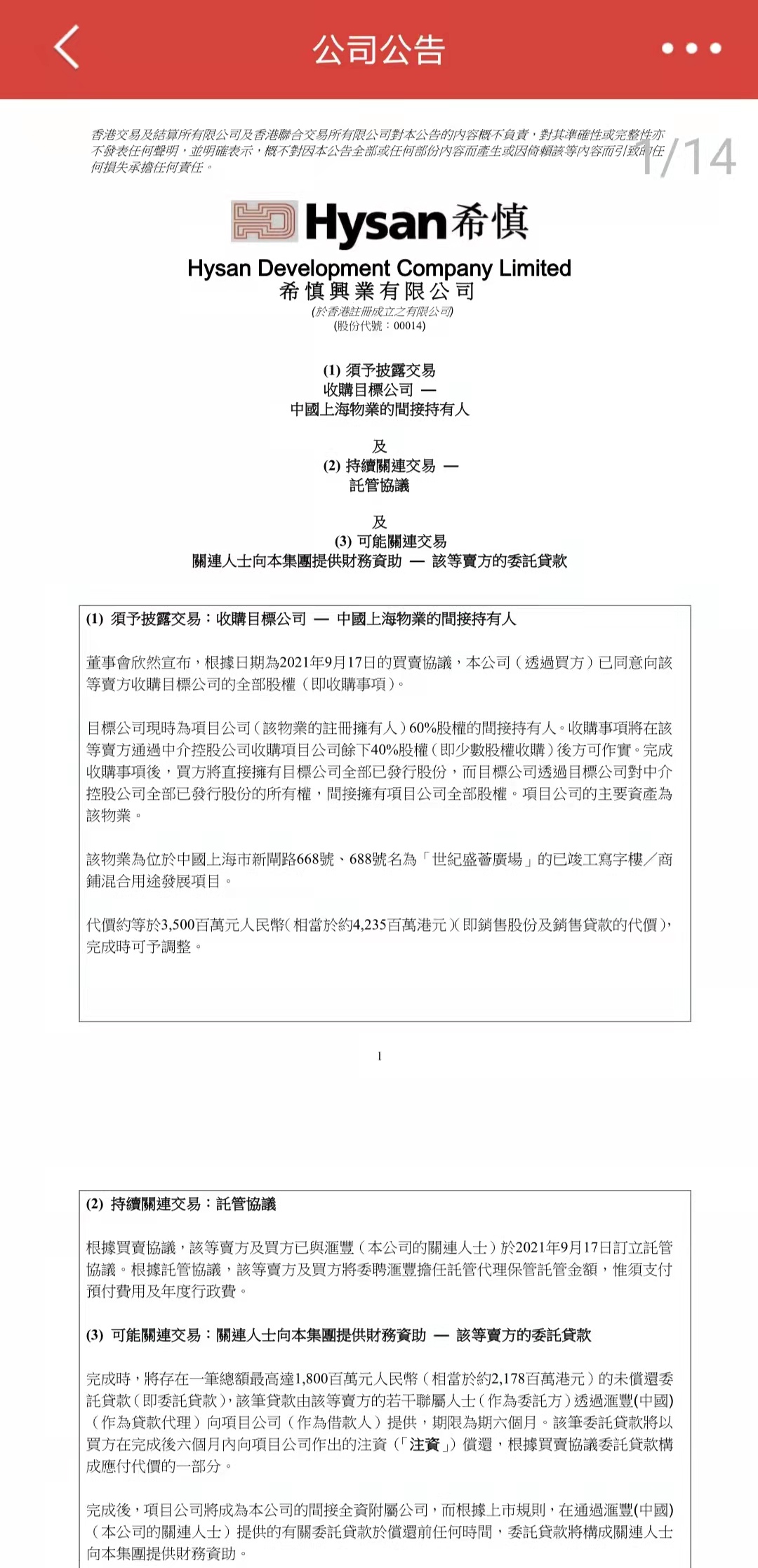 公告表示,本公司(透过买方,即本公司间接全资附属公司希慎(上海))已同意向该等卖方(均为长江实业的间接全资附属公司)收购目标公司Scorecity Investments Limited的全部股权。目标公司现时为项目公司(该物业的注册拥有人)60%股权的间接持有人。收购事项将在该等卖方通过中介控股公司收购项目公司余下40%股权(即少数股权收购)后方可作实。完成收购事项后,买方将直接拥有目标公司全部已发行股份,而目标公司透过目标公司对中介控股公司全部已发行股份的所有权,间接拥有项目公司全部股权。项目公司的主要资产为该物业。