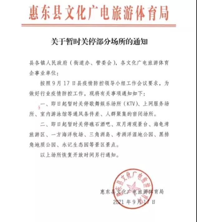 9月17日,惠东县文化广电旅游体育局发布通知,为做好疫情防控工作,即日起将暂时关停部分文旅场所。