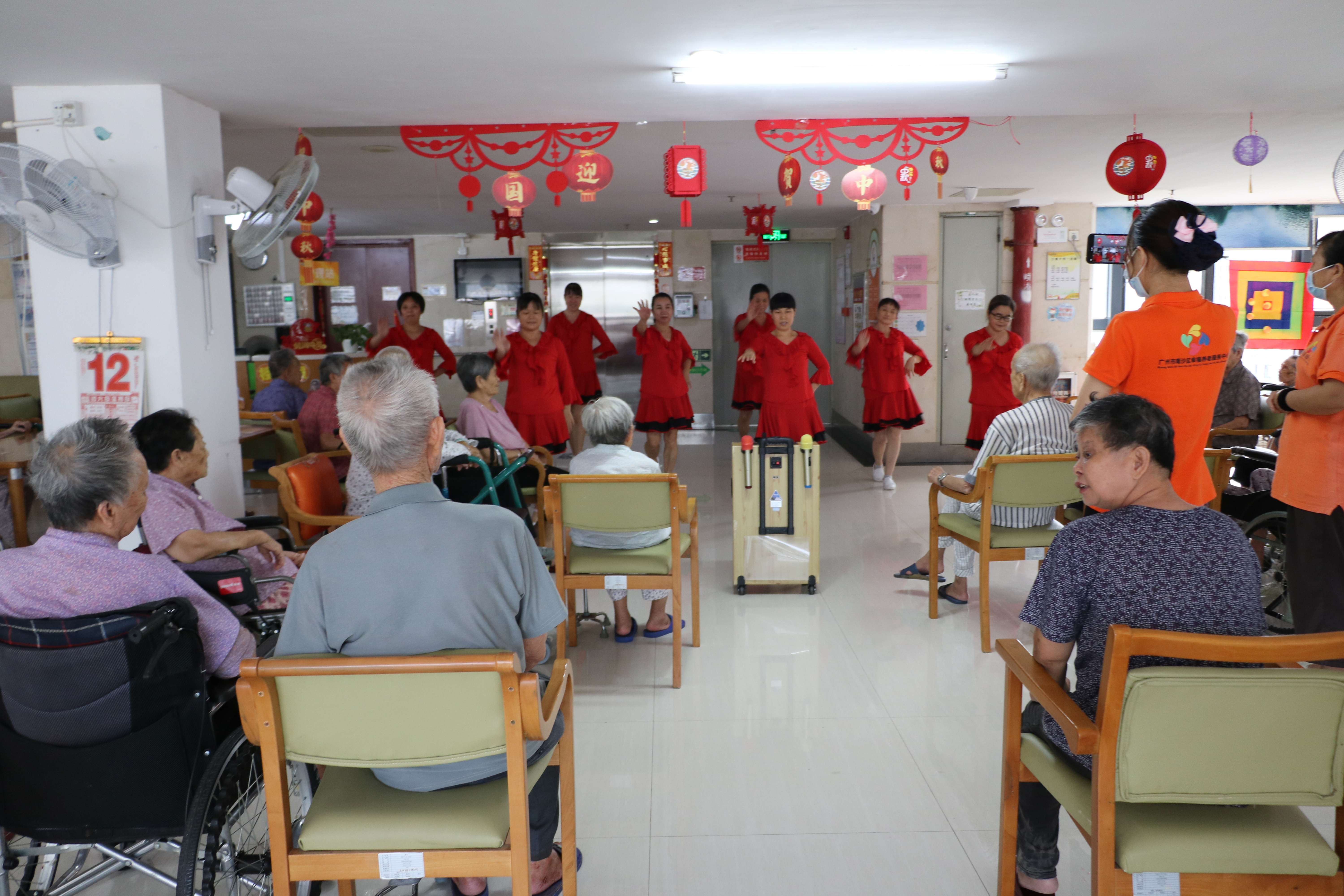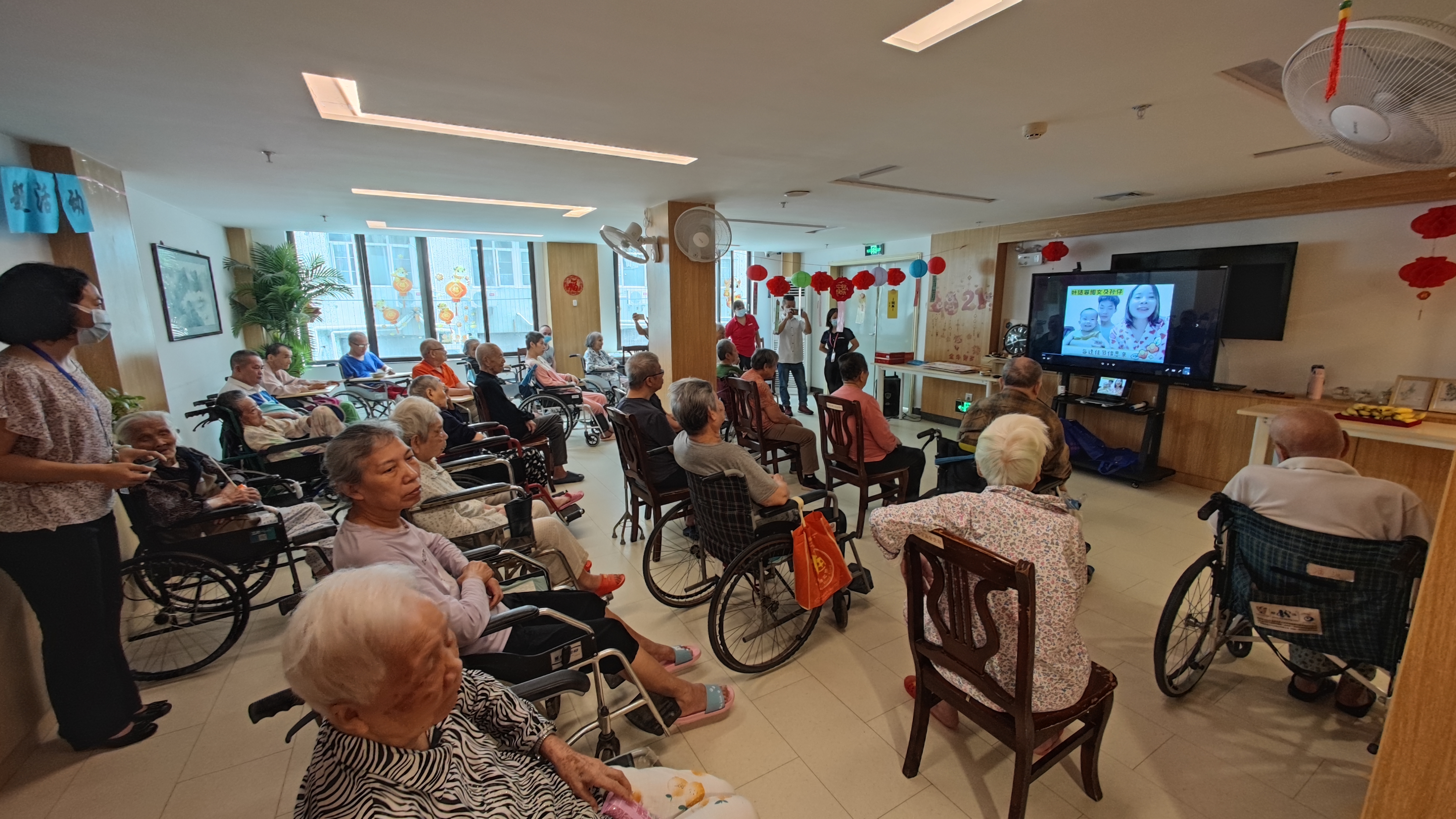 由于养老院还在封闭状态,家人无法入院和长辈们团聚,广州心慈养老院的工作人员,特意提前与家属沟通、准备,录制了中秋节目,在节日当天的活动中播放给院内的长辈们看。